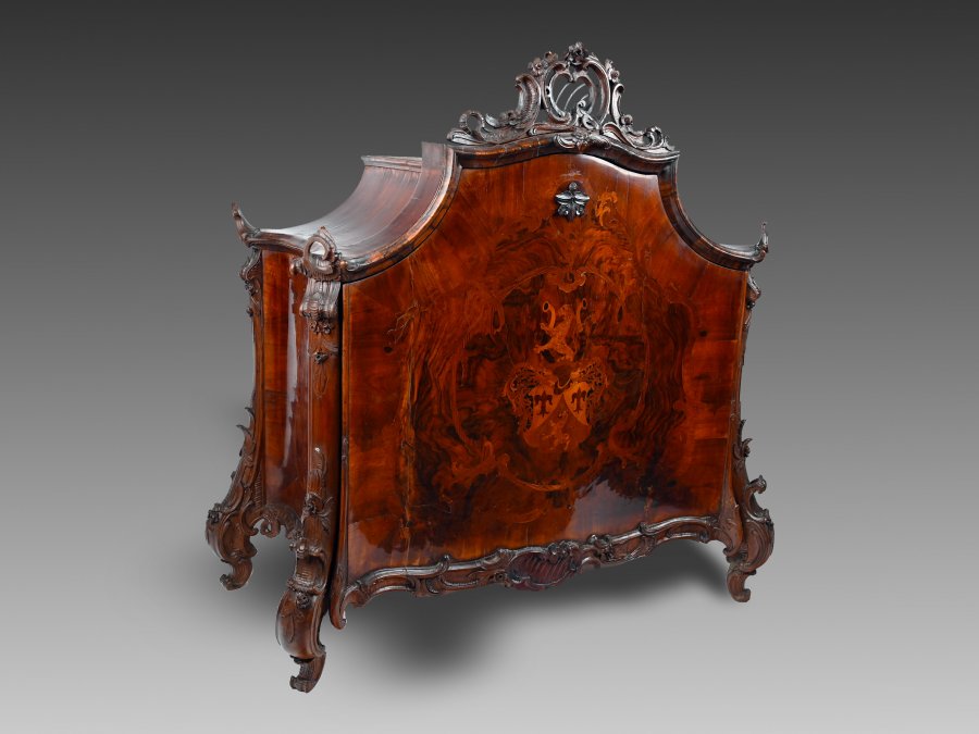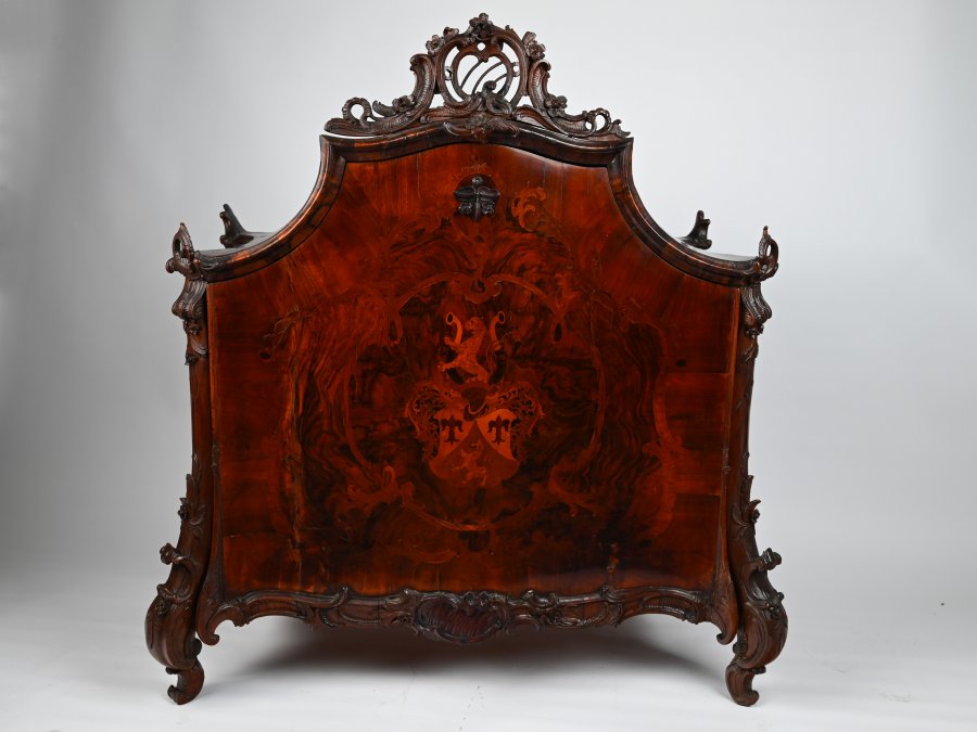 Exceptionally well-crafted rococo tabernacle superstructure with a rich inlay depicting a lion. Masterfully carved on the rim. Inside a set of drawers. Completely restored. Excellent condition.