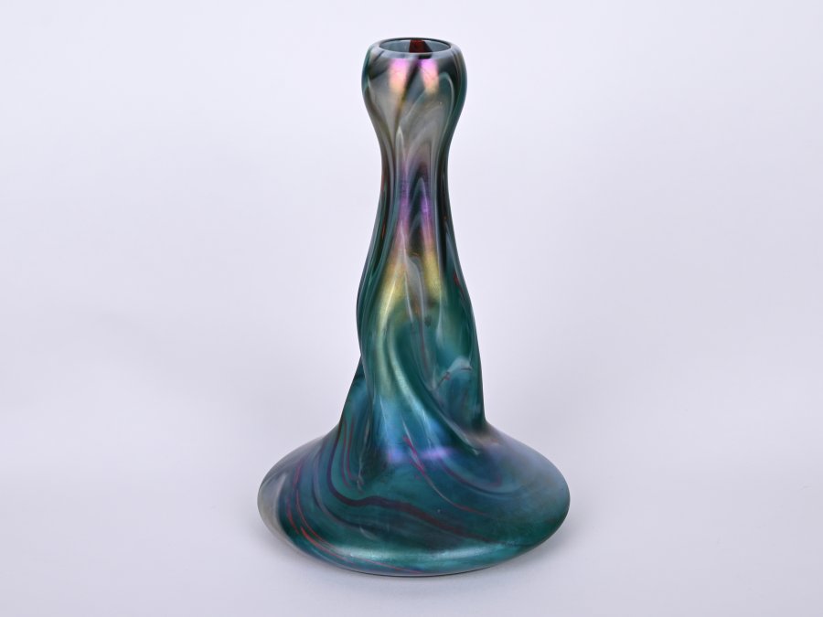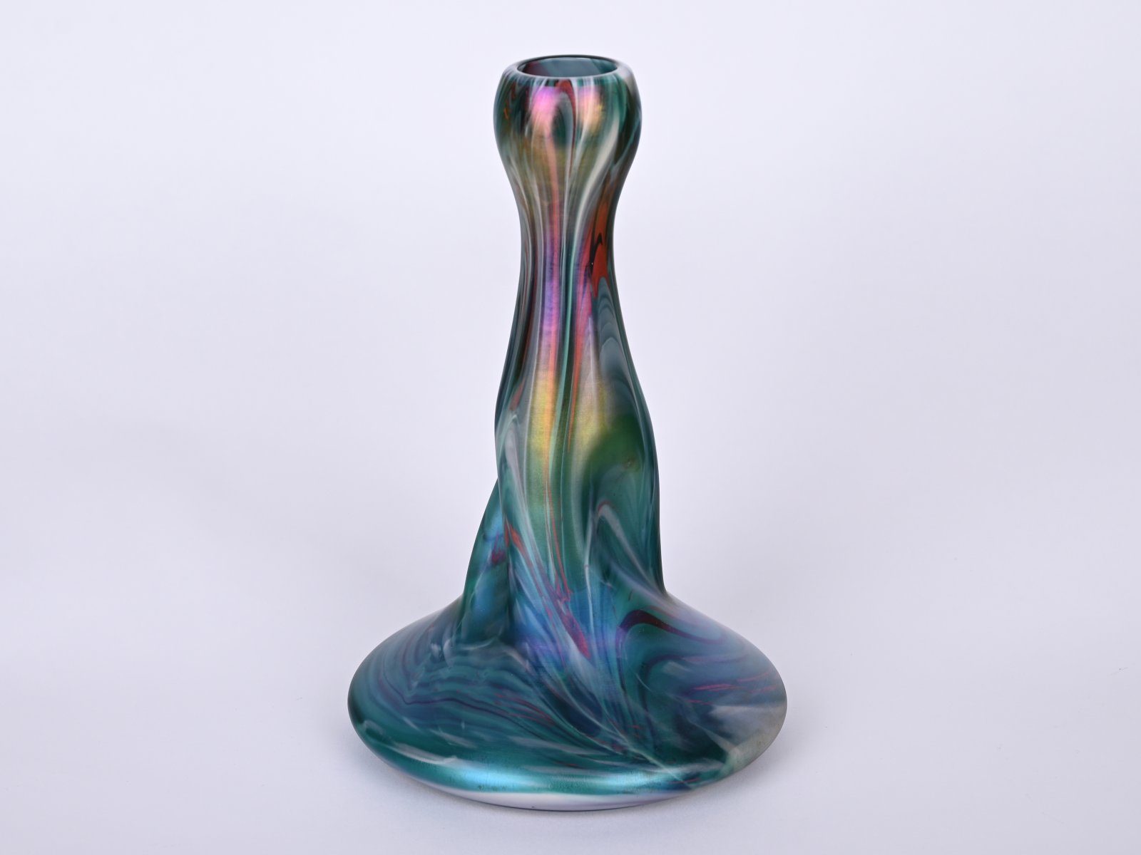 Irised opalescent blown vase on an extended base with slightly twisted shape, manufactured by Rindskopf & Söhne.