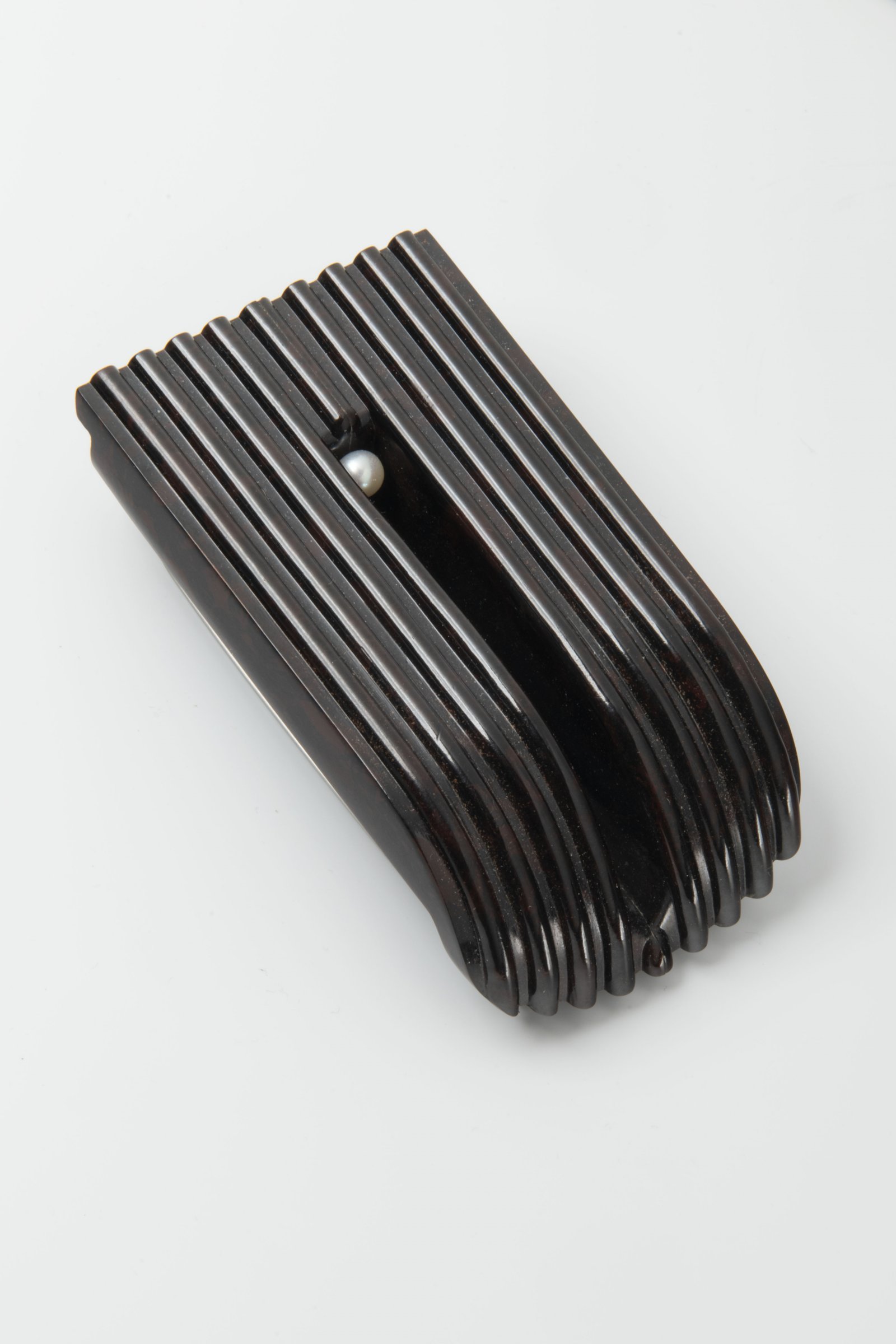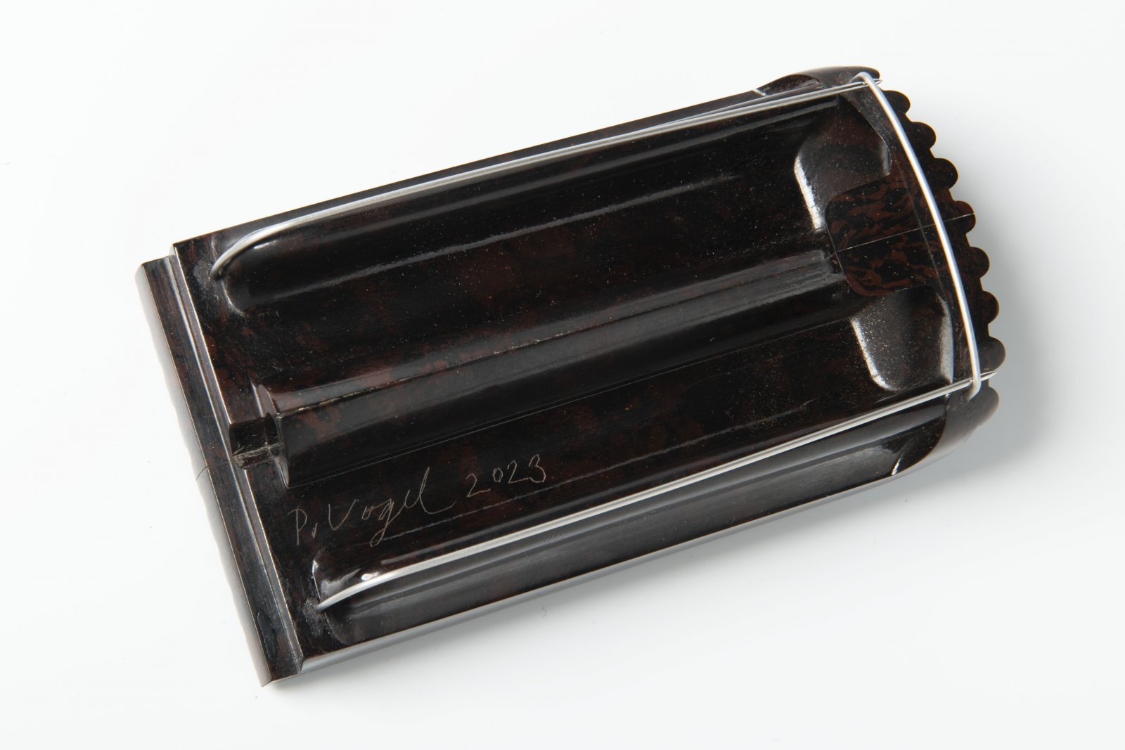 The Art Deco Cars bakelite brooches bring to life the inspiringly magical Art Deco style, its elegance and nostalgia, reminiscent of the iconic details of old limousines. The combination and mutual aesthetic symbiosis of Bakelite and pearls evokes a sense of elegance and creates harmony between contemporary and retro aesthetics. This retro collage is not only found on the front, but also in the organic design of the back of the brooches. The detailed workmanship with the elegant tension of the overall shape emphasizes the impression of movement and speed.