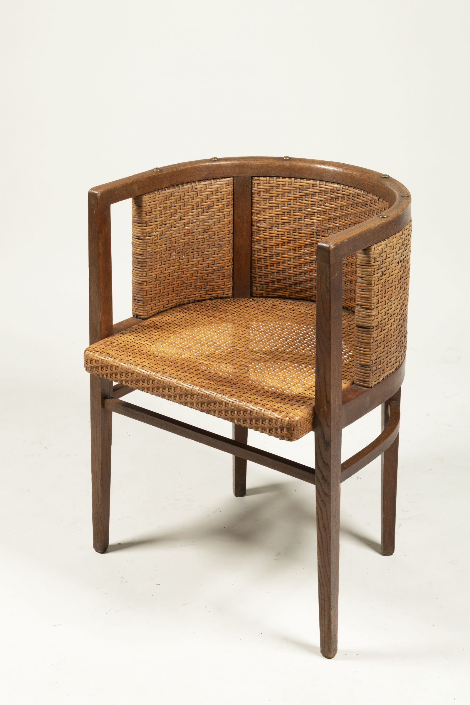 A variant of model 1307 by a prominent representative of Viennese Art Nouveau. Wilhelm Schmidt was an architect and designer, a student of Josef Hoffmann. After 1901, Schmidt was a designer at the Rudnik workshops in Prague. Marked by the manufacturer on the reverse: Prag-Rudniker Korbfabrikation / WIEN / VI. Mariahilferstrasse No 1a. Lit.: Prag-Rudniker product catalog, Vienna 1902/3, p. Modern I, Model No. 1307 – E. B. Ottillinger, Korbmöbel, Salzburg/Vienna 1990, p. 108.