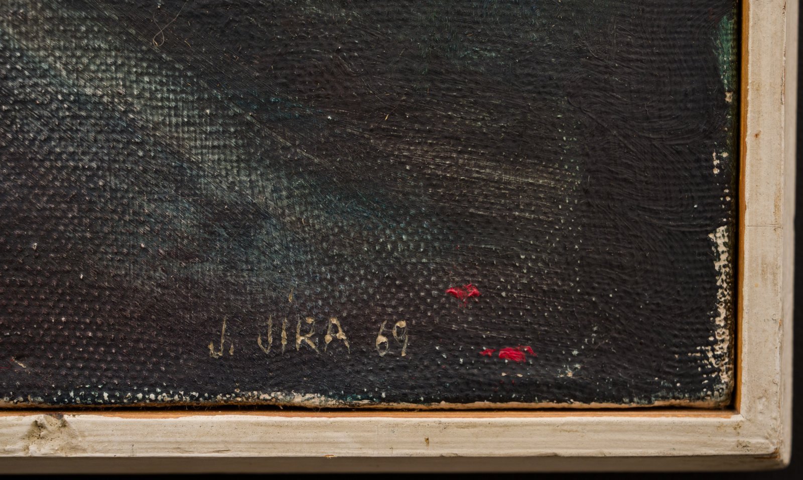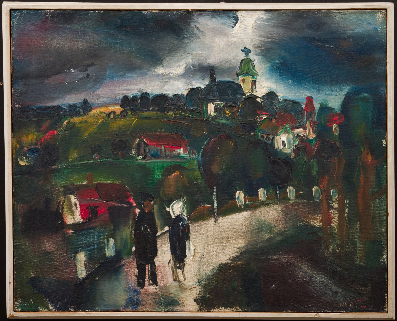 Josef Jíra's autobiographical world includes thoughtful symbols, experiences, and favorite places that were formative for him in many ways. The church in Jenišovice dominates his native village and is linked to Jíra's childhood memories. The deeply felt landscape with a foreground scene, drawn in detail with thick layers of colorful paste and darker areas, is his diary with a universal emotional charge – the landscape blends his loving perception of the landscape of his childhood with the gloomy demons with which he fought intensely within himself.