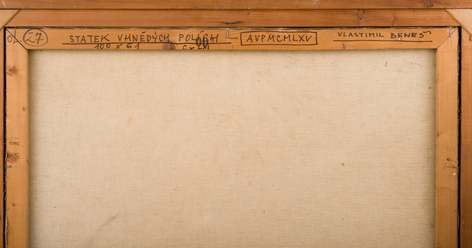 n object does not have to be poetic to be perceived as poetic; in Beneš's paintings, it is color that poeticizes objects and landscapes. Influenced by Renaissance painting, Cubism, modern neo-primitivism, and folk art, he developed his own recognizable concept of space, the volume of objects, and their place in that space. His frequent subjects—village buildings, industrial landscapes, mines, and city outskirts—did not seek recognition among the slogans of the time. They stood as if outside their time. Through his works, the author brought to life the universal elemental nature of the world and remained firmly rooted in the present in the full sense of the word. For Beneš, the 1960s were a time when he was able to present his work to public criticism for the first time in a major exhibition (1962 in Hradec Králové), when he acquired a new studio space in Prague-Vršovice, which became the subject of several of his paintings, and when he undertook his trip abroad to Italy. Beneš preferred to paint in the fall and did so most often, saying himself that he was an autumn painter. The melancholic view of the landscape with a farmstead is typical of the artist's work in terms of both painting and subject matter, which he fully developed in the 1970s. The large-format painting Brown Landscape with a Farmstead from 1965 ranks among the earlier works in the context of this motif and shares common features with, for example, the landscapes of Ota Janeček, with whom Beneš associated, even though he was considered a rather unsociable loner. The title and date of the painting are located on the verso.