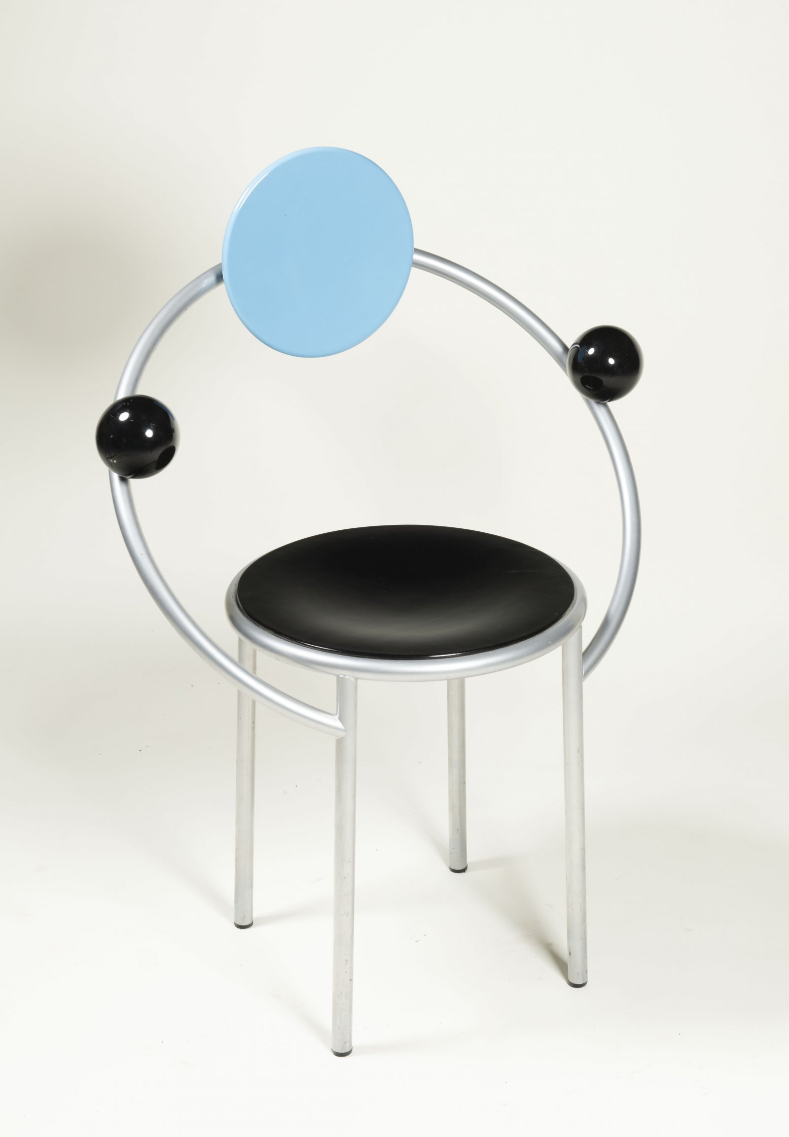 The "First" chair is an iconic, almost sculptural work created by Michele De Lucchi. The designer pays tribute to Alexander Calder with its lightness of form. Produced in small series, the chair brings a new concept of the perfect combination of industry and craftsmanship in true Memphis style. It features a blue adjustable backrest and two black balls that serve as armrests. Michele De Lucchi is an Italian designer and architect. At the turn of the 1970s and 1980s, he was a leading representative of radical architecture and participated in the most important Italian design movements of the time. The typical signature of the Memphis group is striking colors, asymmetrical shapes, and wild color combinations. Their work was inspired by art deco and pop art, as well as futurism and the art of the 1950s. The chairs comes from the important collection of artist and collector Ivan Steiger, who purchased it in the 1980s.