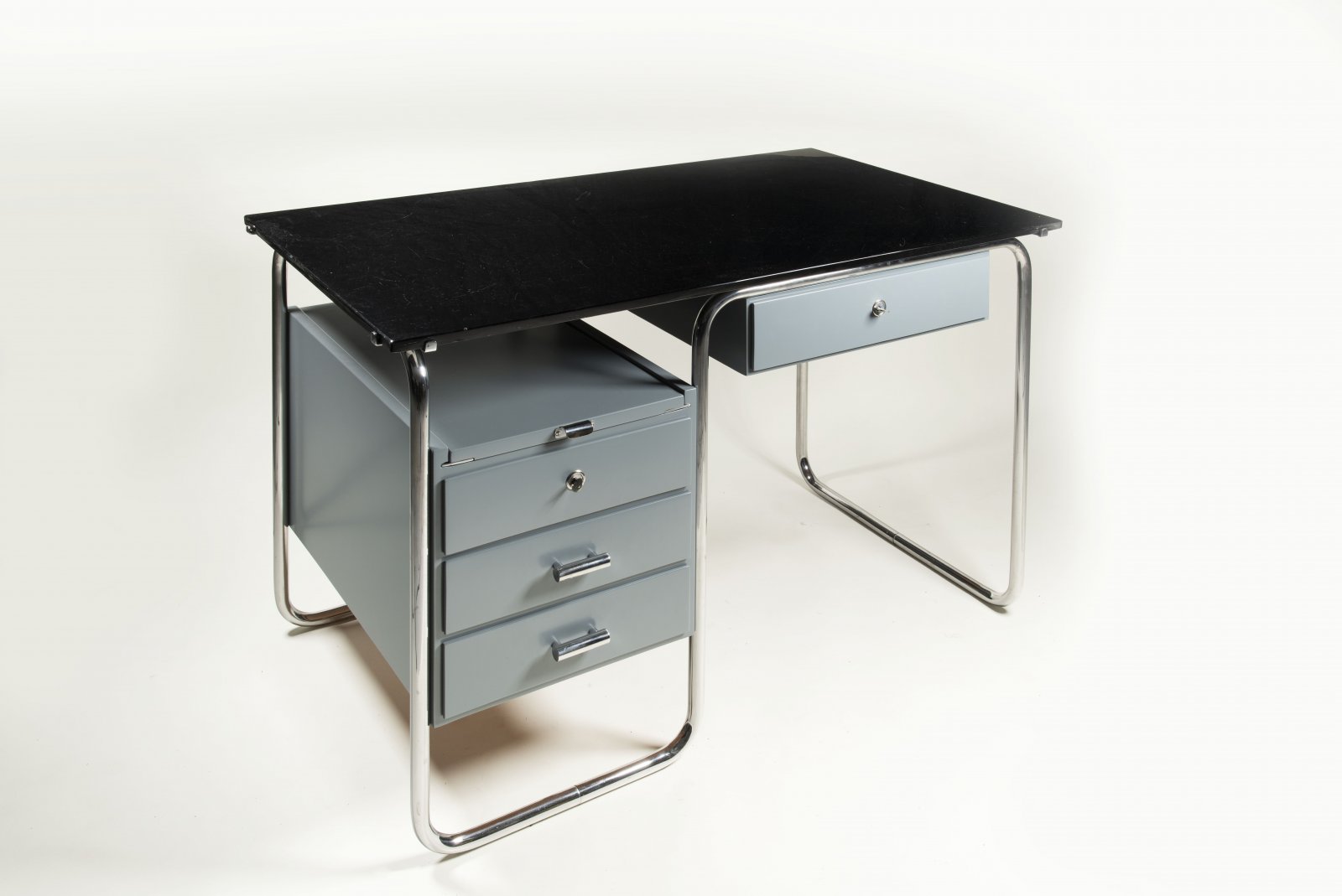 This exceptional designer desk from the Czech functionalist period features a solid black opaxite top held in place by chrome brackets on a chrome-plated bent tubular steel frame. The storage space consists of a total of four drawers and one pull-out shelf. Although it bears similarities to the desks of Rudolf Vichr and Jindřich Halabala, it is a unique model that was not mass-produced but made to order. Completely restored.