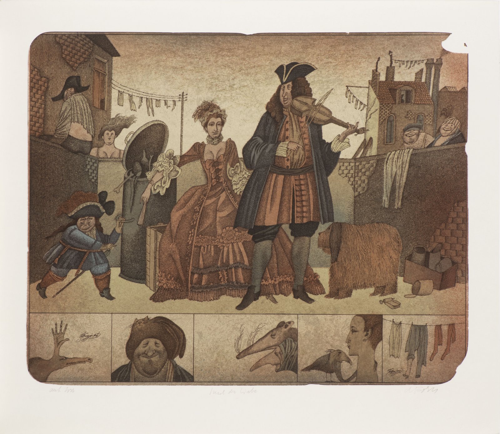 Adolf Born's Island of Love is a symbolic intertwining of the present with the admired past, which the author loved very much. Some of his compositions, although grotesque, may also carry a more serious reflection on the time of their creation. The figures set in urban corners are a kind of lament by Born for a vanished world he admired and a protest against the aesthetics of the era with which he could not identify. He created his own more colorful world, reflecting his unique poetics and bringing together his favorite personalities and animals.