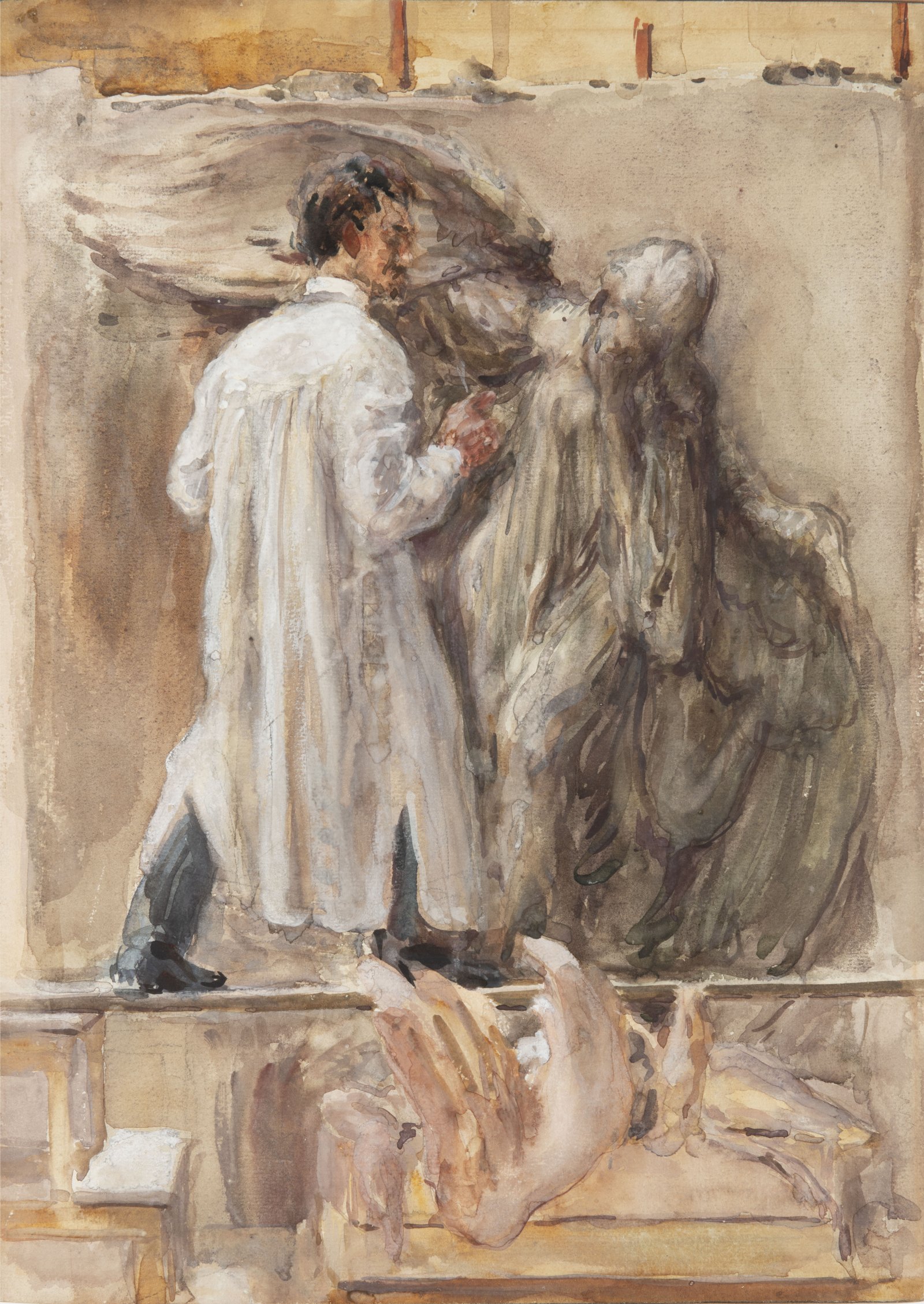 At the turn of the century, Miloš Jiránek's work focused mainly on people, whom he depicted in their natural forms and familiar surroundings. Miloš Jiránek was a member of the Mánes Union of Fine Arts and an activist in cultural life – he helped organize exhibitions by August Rodin and Edward Munch. Both exhibitions had a significant influence on the emerging generation of young artists. In the presented work on paper, he captured Bohumil Kafka working on the relief Angel of Death over a Dead Swan. The sculptures can be seen, for example, at the Vyšehrad Cemetery on the grave of Kafka's wife Berta and the Jirásek family.