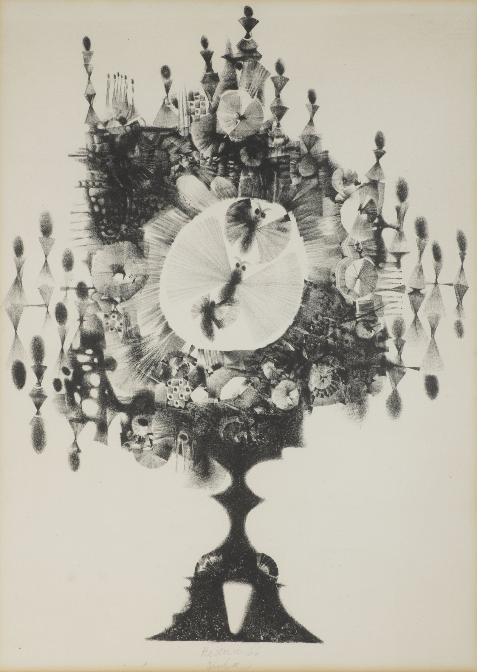 Several moths dance inside the cone of light, surrounded by a jumble of sparkling decorations. This melancholic series of lithographs by Jiří Trnka is rarely seen on the market. From the estate of Jiří Trnka's daughter, Helena Trösterová, née Trnková.