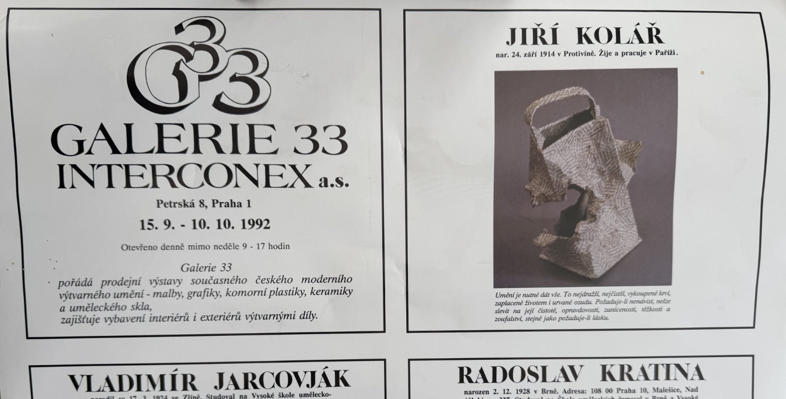 Jiří Kolář never ceased to be a poet. Although his work is playful and full of puns, his use of collage and chiasm is the sophisticated result of long experimentation. Jiří Kolář places the image, as a mere fragment of reality, into context, while the word becomes an image. He transformed himself from a poet into a visual artist, giving words a three-dimensional form and turning everyday objects into poems. Destruction leads to the creation of a new means of expression, and the story is told by an object that becomes the bearer of the message. The text is destroyed to such an extent that its reading is abstracted into the mere perception of image points and lines, thus preventing conventional perception. The original function of the object that carries the collage is only reminiscent in its shape and becomes an ironic carrier of new meaning. Chiasmage is a collage technique using paper printed with symbols, torn into small pieces and glued to a base in all directions as "chiasmata." Jiří Kolář's work is an extraordinary phenomenon on the art scene. He was a member of Group 42, UB, and Křižovatka. He was an authority and a personality around whom various artists and intellectuals gathered. He coordinated various activities, such as the samizdat edition Petlice, and in 1977 he signed Charter 77. From 1980, he lived with his wife Běla in Paris, where, together with other Czech emigrants, he supported the publication of Revue K. The work on offer was part of an exhibition held at Prague's Galerie 33 Interconex in 1992, which also reproduced the work on a poster for the exhibition. The work comes from the estate of artist Vladimír Preclík.
