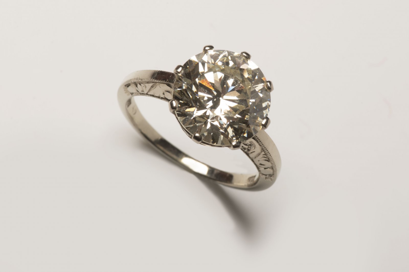 Ring set with a natural round brilliant cut diamond, cut after 1929, weighing 5.16 ct. Czechoslovakian hallmark used between 1929 and 1959 (lion). High-quality jewelry work. Purity 585/1000, hallmark (lion), total weight 4.40 g. Diamond dimensions 11.02 - 11.18 x 6.75 mm, calculated weight 5.16 ct, color K, clarity VVS2, cut very good VG. Expert opinion by Dr. Jaroslav Hrouz included.