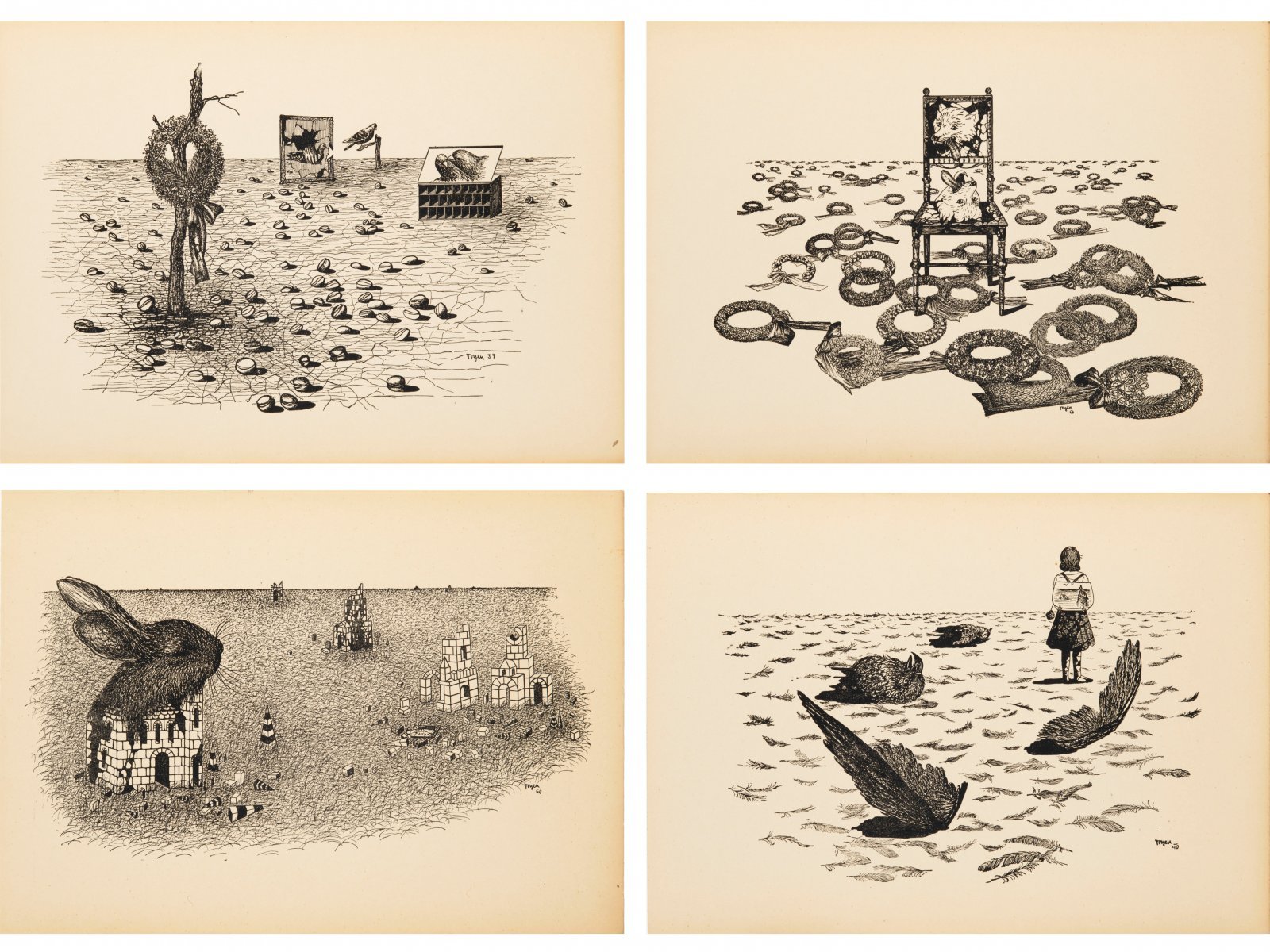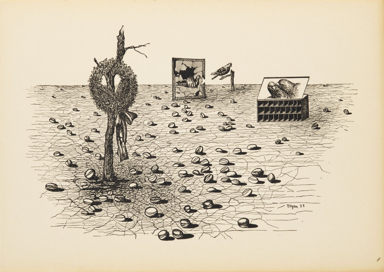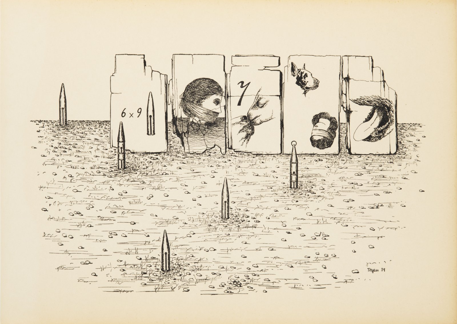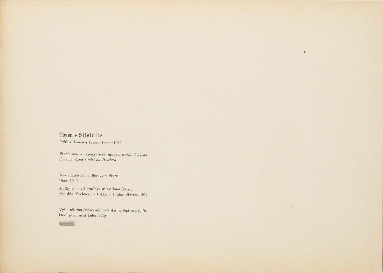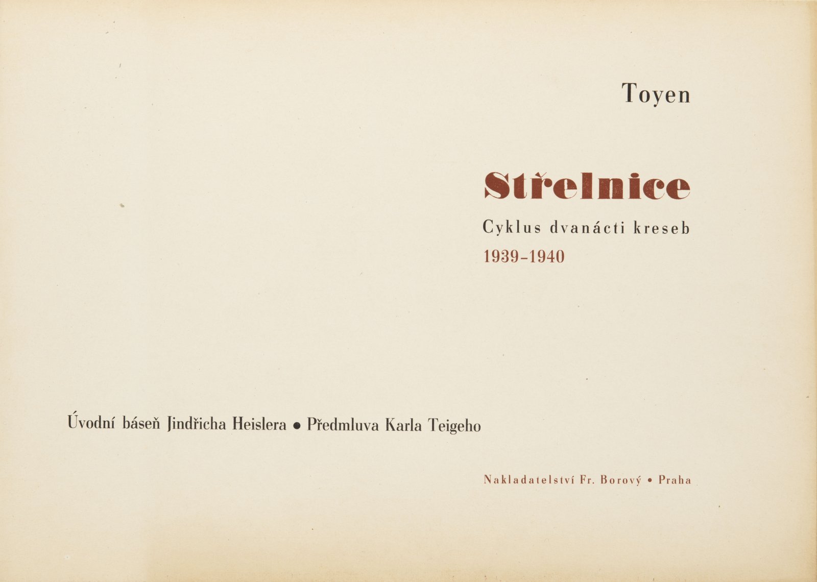 A series of twelve prints in folders, based on drawings by Toyen, published by František Borovský, 1946, Prague. Introductory poem by Jindřich Heisler, foreword by Karel Teige. Toyen spent the war years in Prague, creating art illegally, often drawings that she published after the war. The Shooting Range deals with folk pilgrimages, which it links to the agonizingly terrifying crimes of war. In the spirit of artificialism, it mixes memories and distinctive poetics with deep states of mind, unsettling us and forcing us to think about what will actually remain after the war.