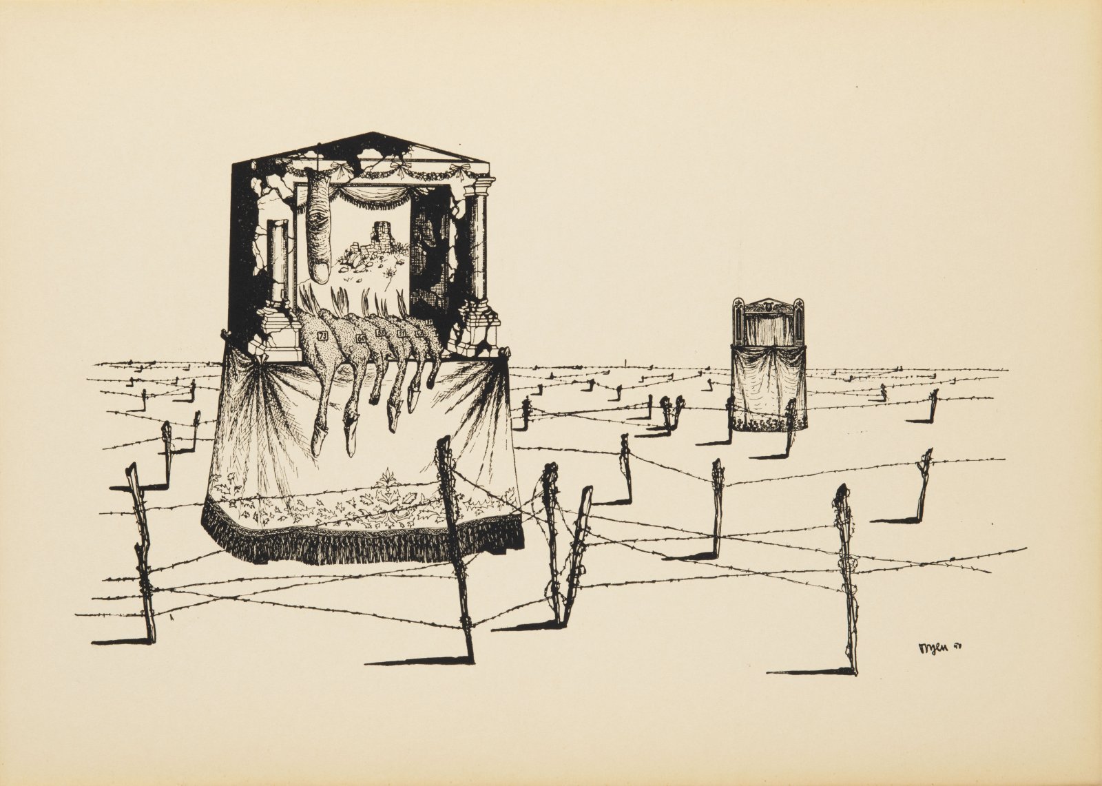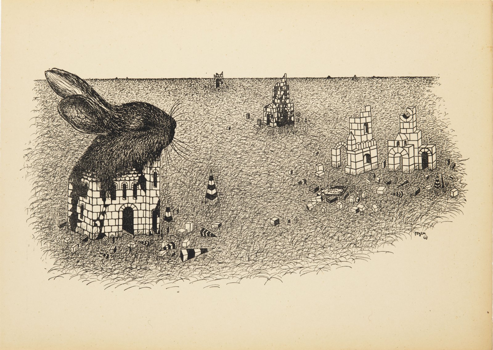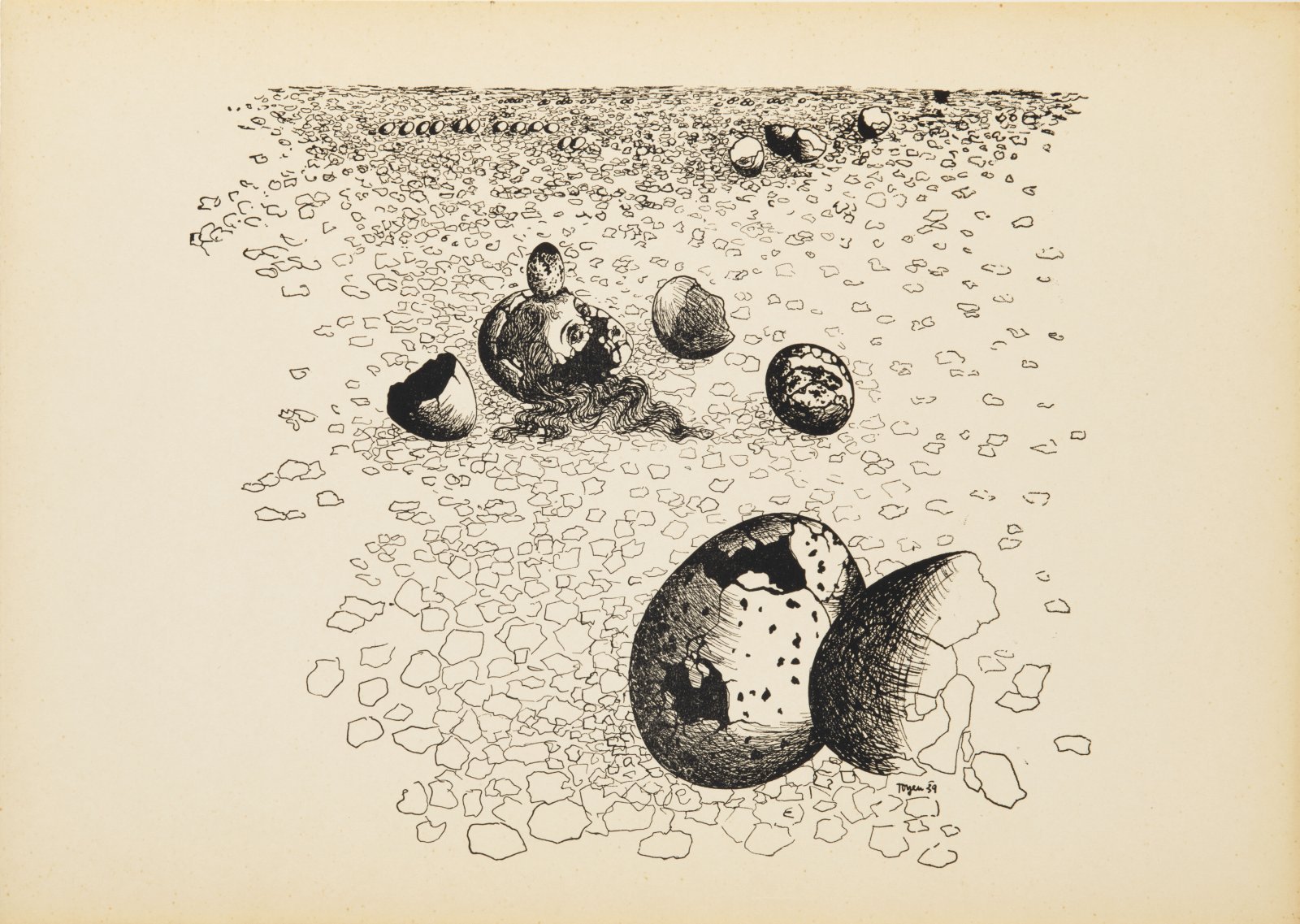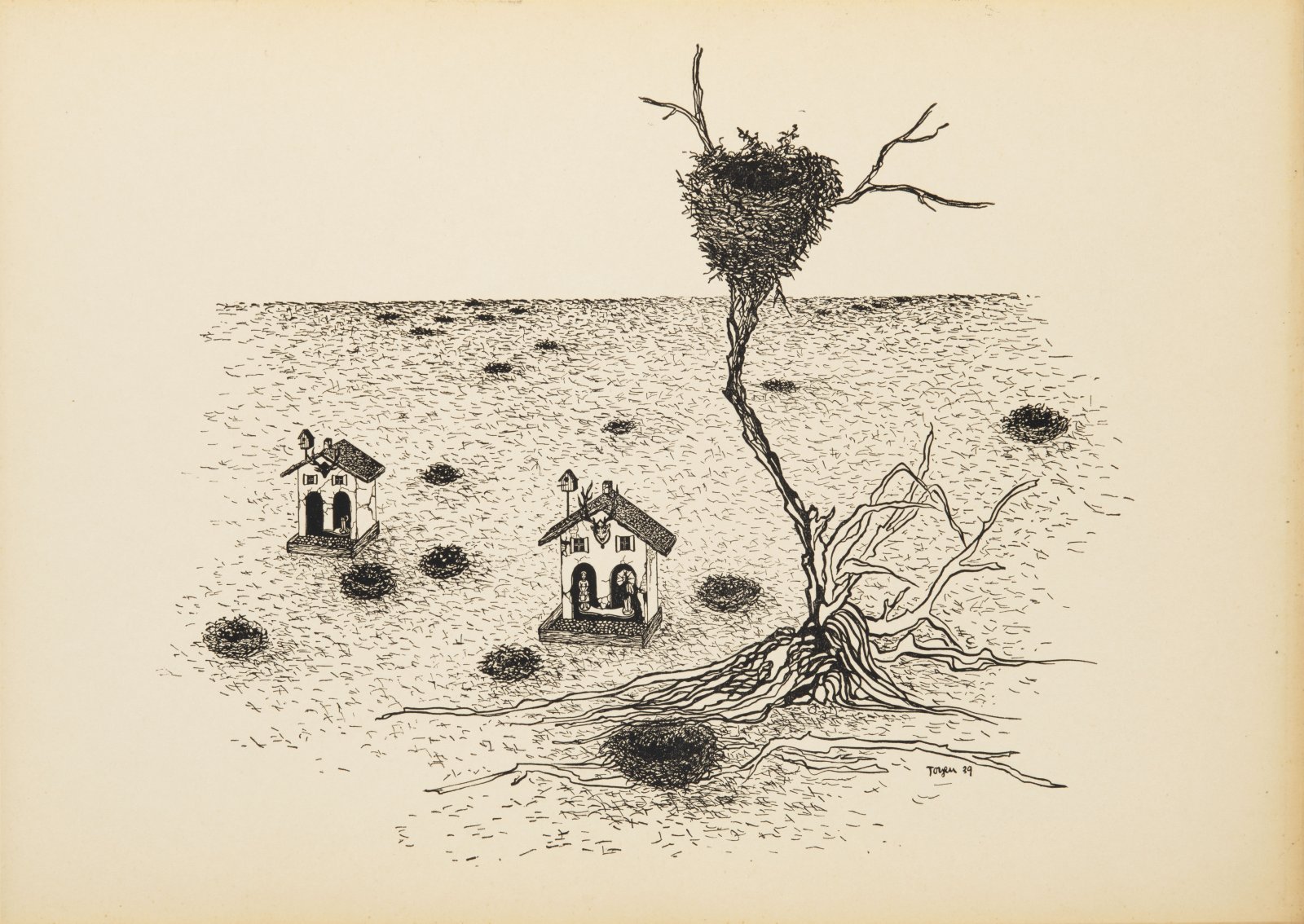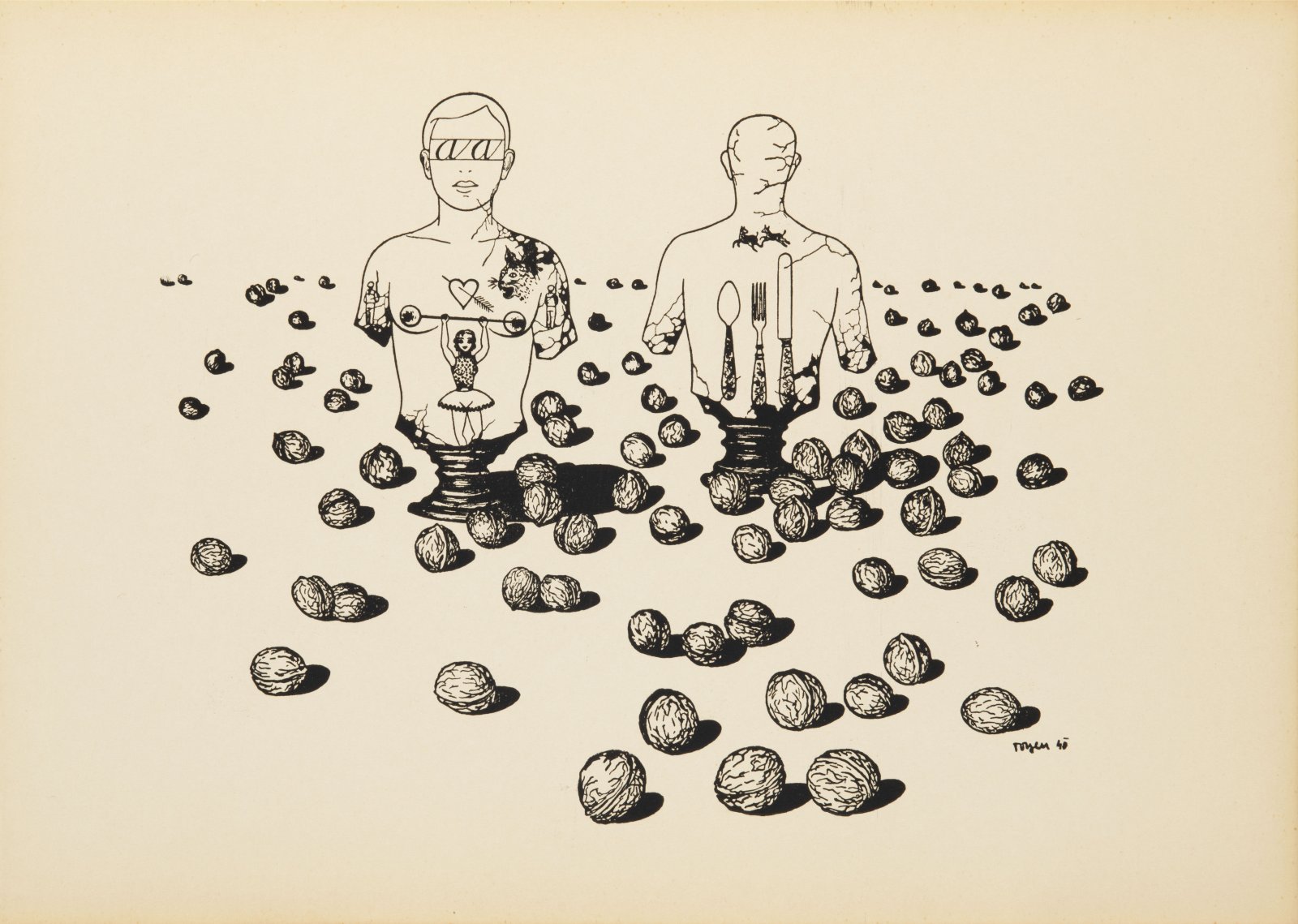 A series of twelve prints in folders, based on drawings by Toyen, published by František Borovský, 1946, Prague. Introductory poem by Jindřich Heisler, foreword by Karel Teige. Toyen spent the war years in Prague, creating art illegally, often drawings that she published after the war. The Shooting Range deals with folk pilgrimages, which it links to the agonizingly terrifying crimes of war. In the spirit of artificialism, it mixes memories and distinctive poetics with deep states of mind, unsettling us and forcing us to think about what will actually remain after the war.