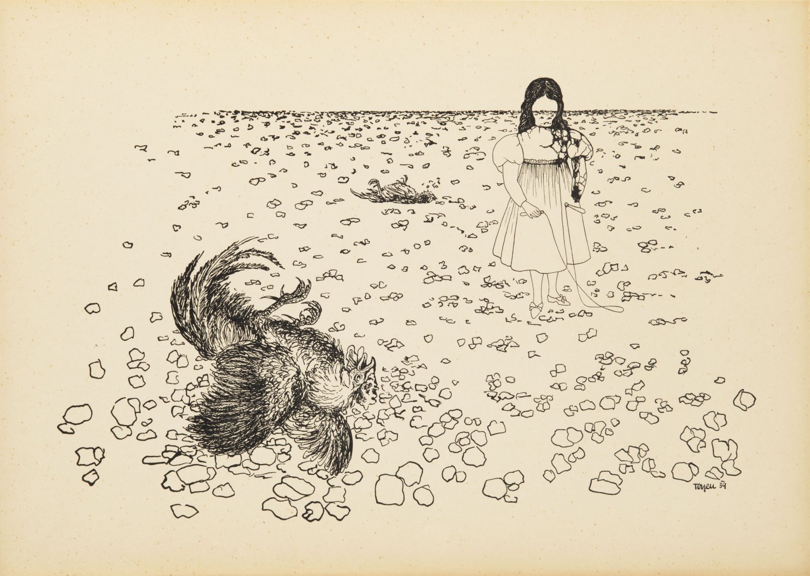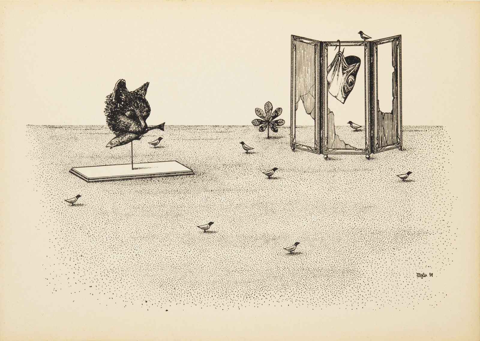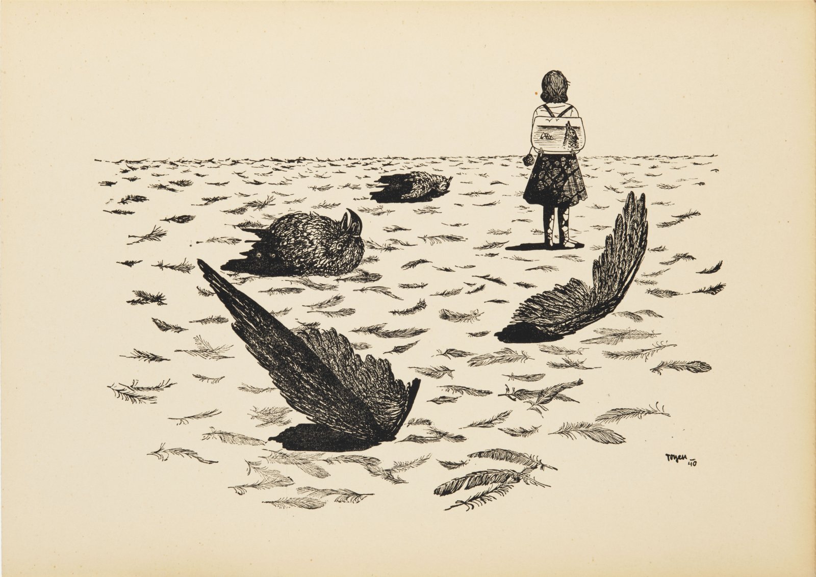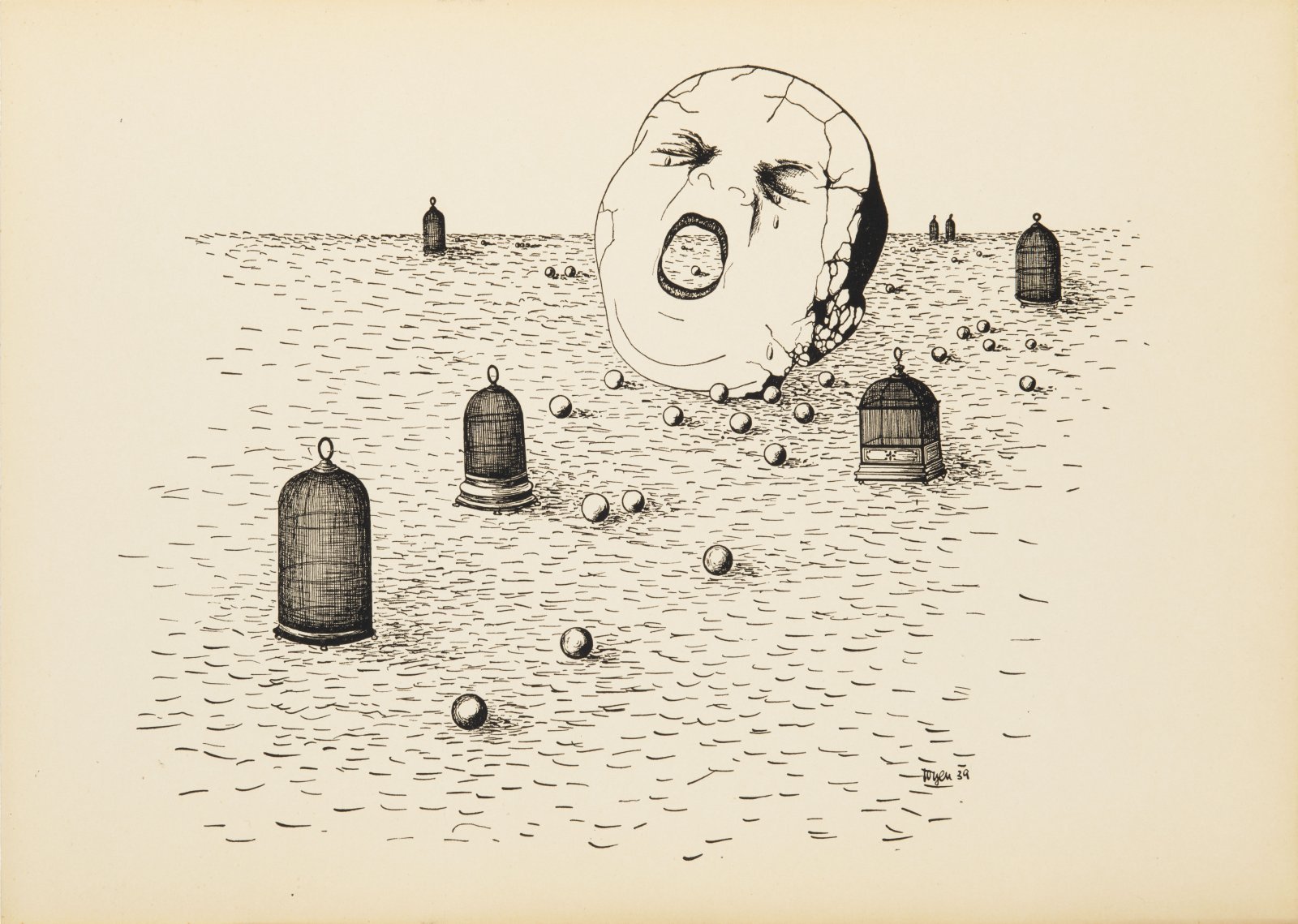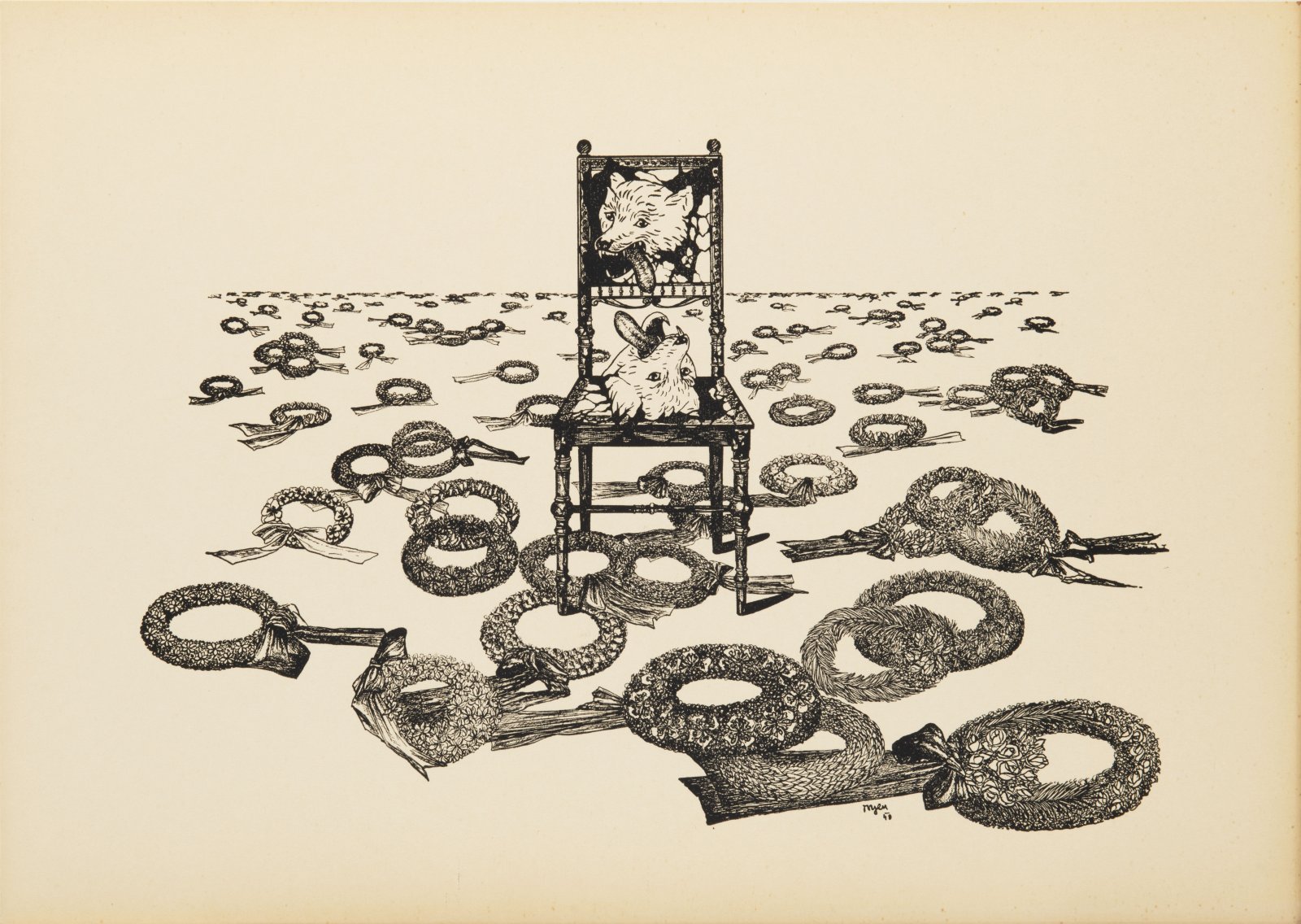 A series of twelve prints in folders, based on drawings by Toyen, published by František Borovský, 1946, Prague. Introductory poem by Jindřich Heisler, foreword by Karel Teige. Toyen spent the war years in Prague, creating art illegally, often drawings that she published after the war. The Shooting Range deals with folk pilgrimages, which it links to the agonizingly terrifying crimes of war. In the spirit of artificialism, it mixes memories and distinctive poetics with deep states of mind, unsettling us and forcing us to think about what will actually remain after the war.