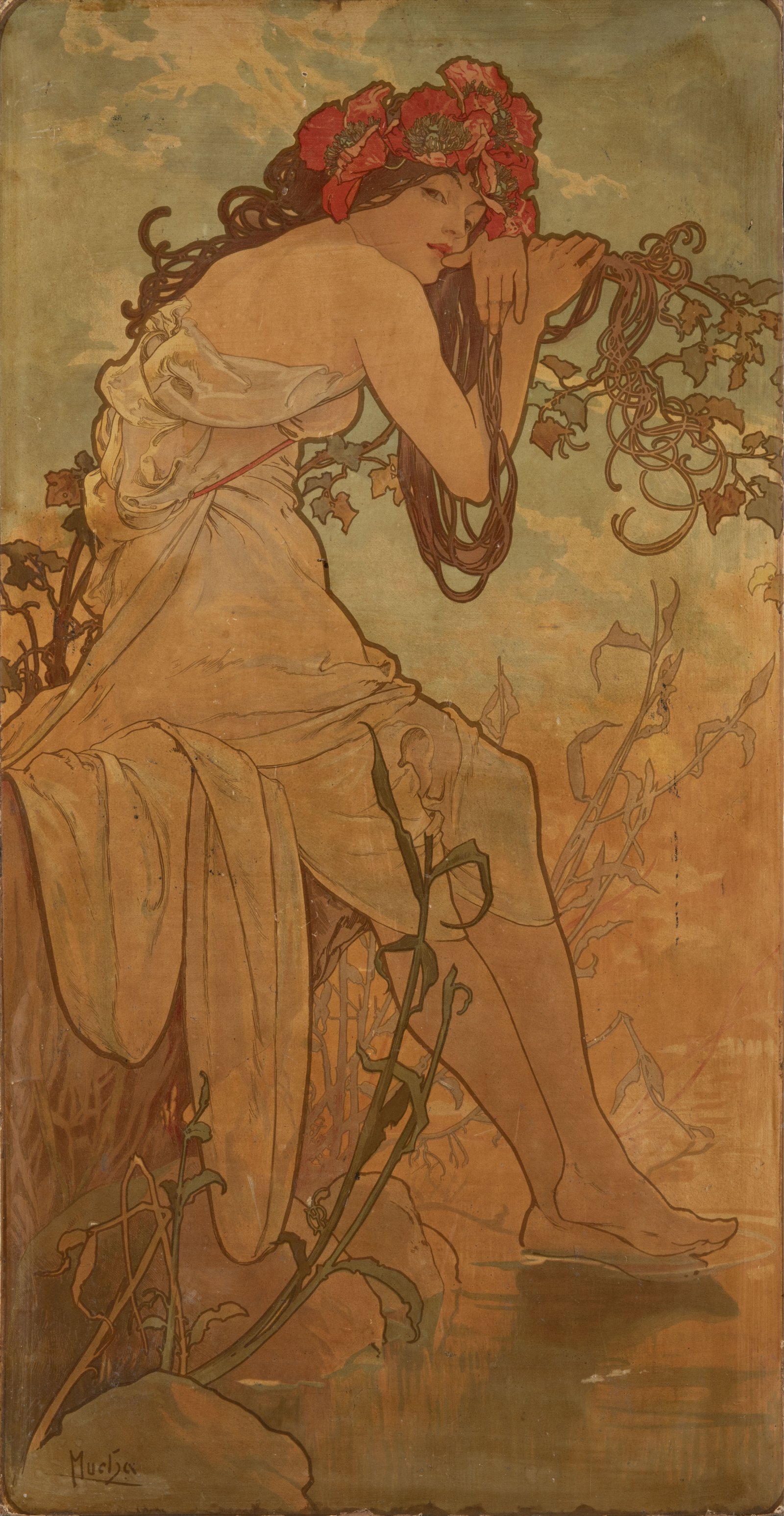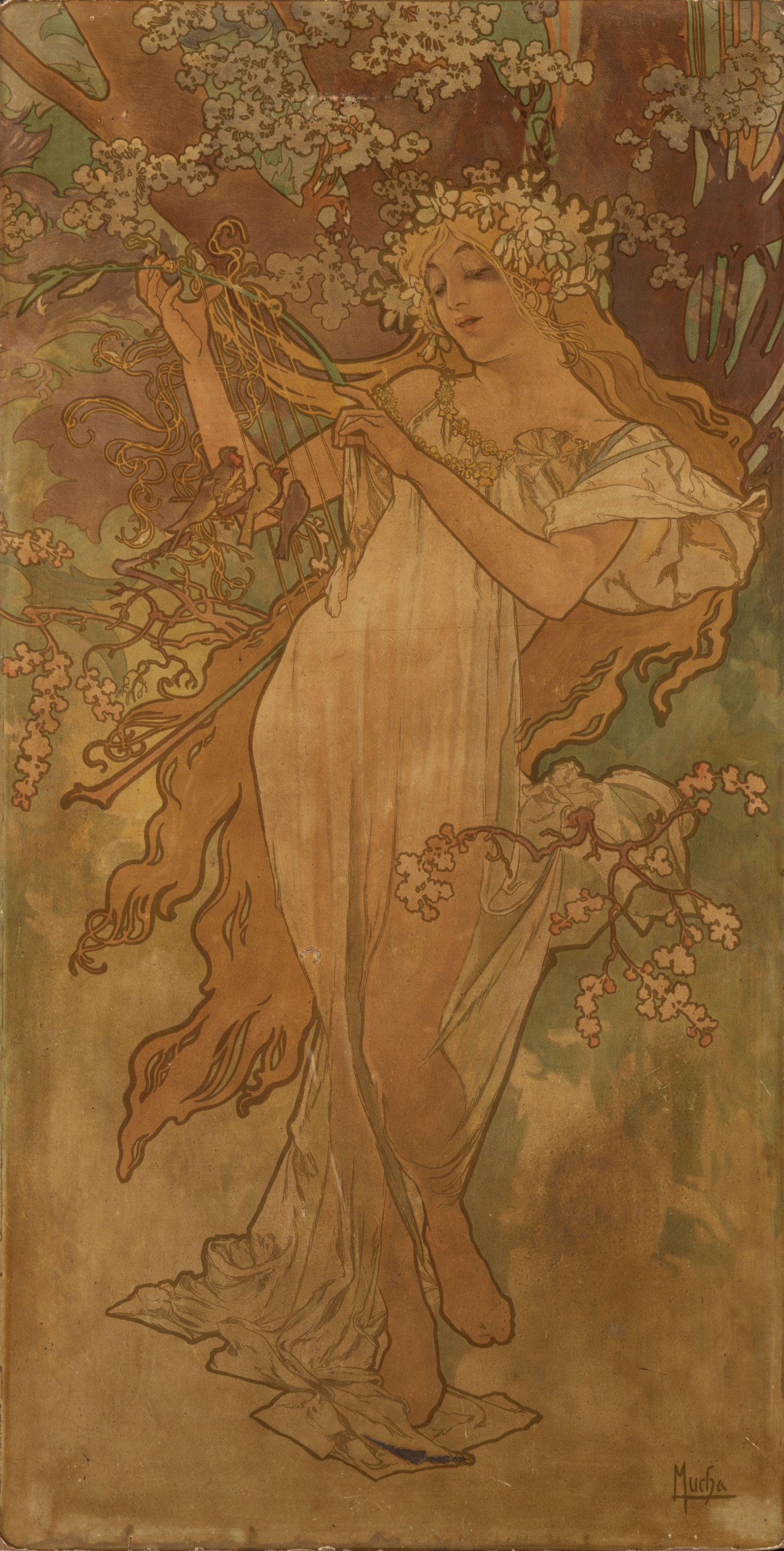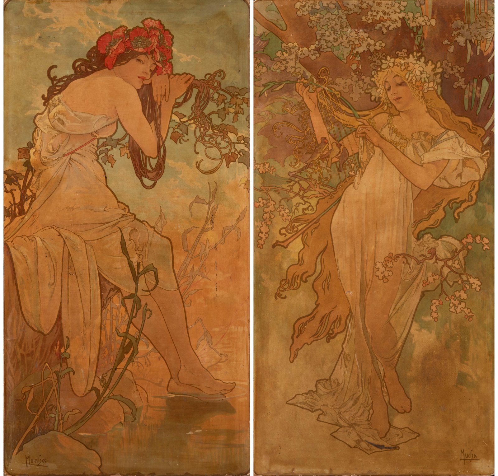 The two original seasons offered are from Mucha's series of decorative panels, which was so popular at the time that Champenois asked him to create two additional sets on the same theme in 1897 and 1900. The idea of personifying the seasons was nothing new – examples can be found in the works of old masters, as well as in other publications by Champenois. Mucha's ethereal women (nymphs) against the backdrop of scenes from each season in the countryside breathed new life into this classic theme. In four panels, Mucha captured the mood of the seasons – innocent spring, sensual summer, fruitful autumn, and frosty winter, which together represent a harmonious natural cycle. Verso label: G. Garault, 24 Rue Pigalle, Paris.