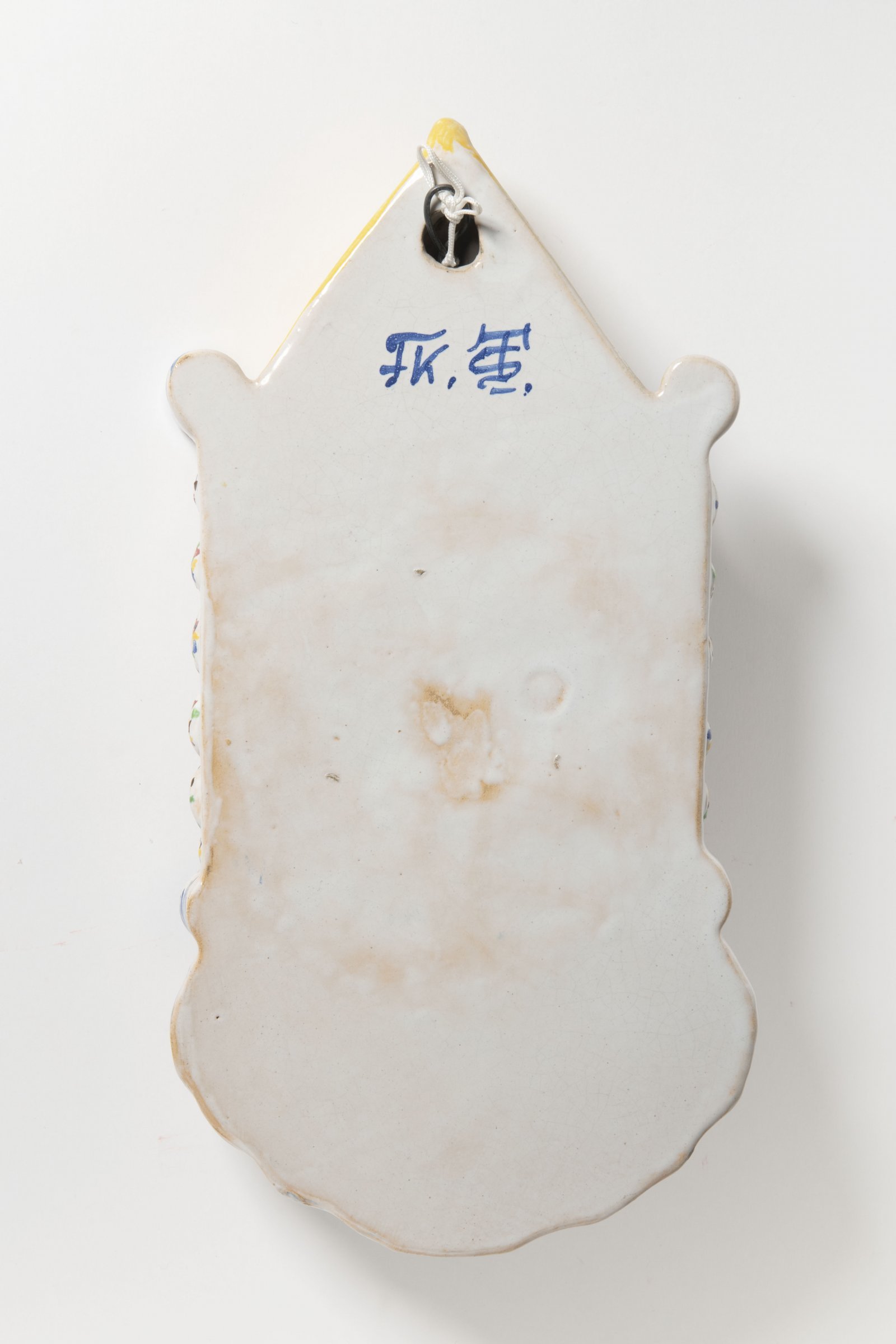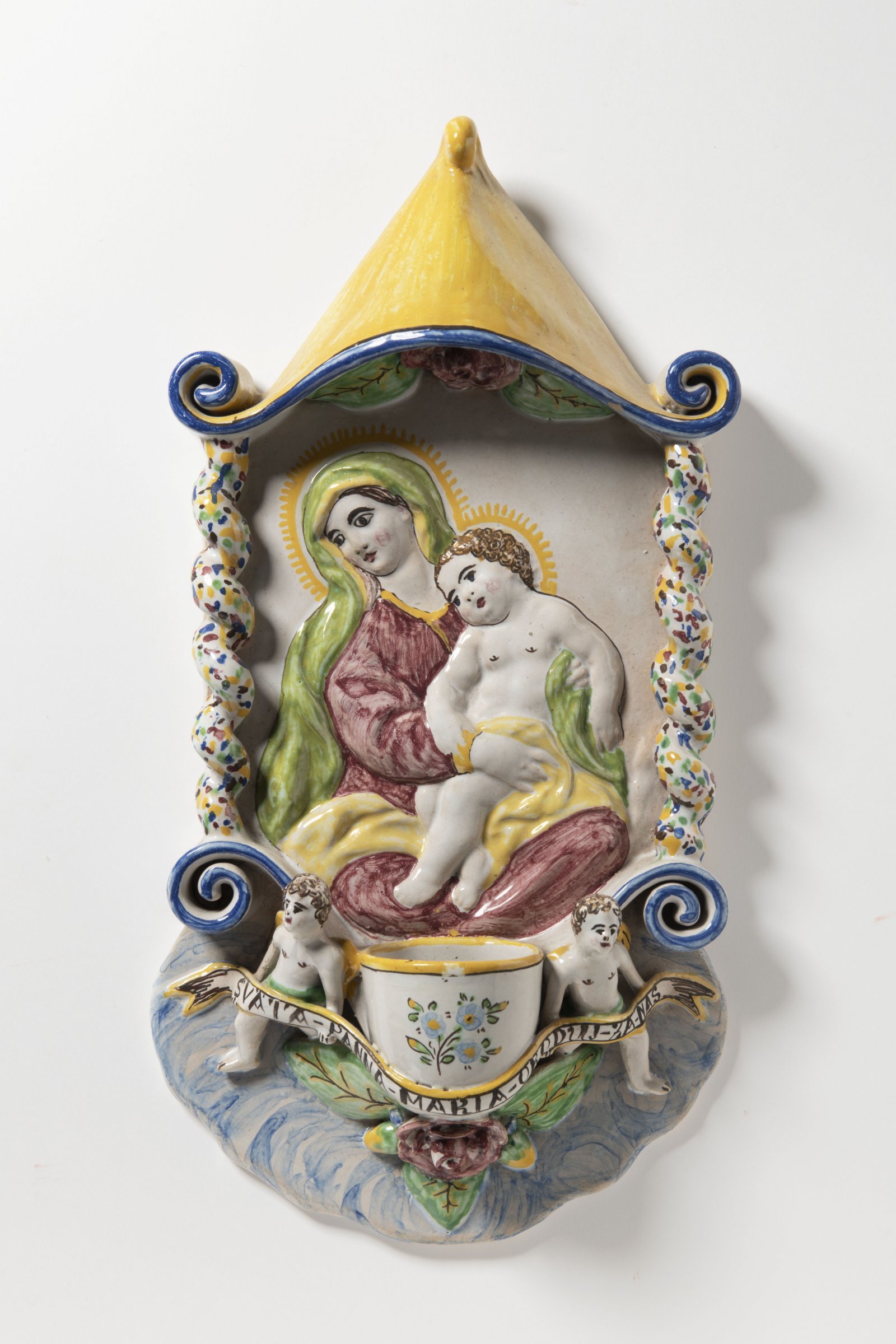 A charming sprinkler from the Stupava ceramics factory with a motif of the Virgin Mary with the baby Jesus and decorative volutes and twisted columns. Text at the bottom: HOLY VIRGIN MARY, PRAY FOR US. Excellent condition, minor abrasion.