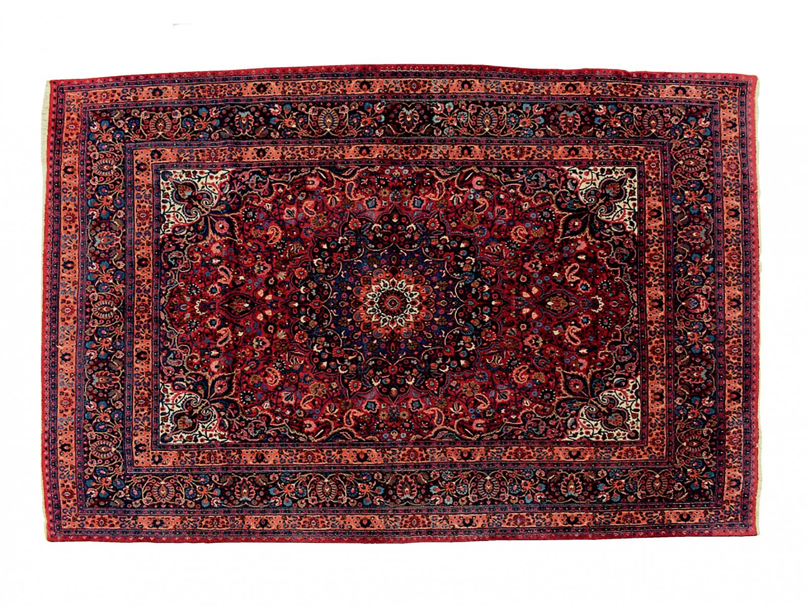 A hand-knotted wool rug on cotton warp, a beautiful giant piece in the typical design and darker colour palette of the historic Khorasan region, centred on the pilgrimage city of Mashhad (north-east of Iran). The history of carpet production in the region is reliably documented from the 16th century at the latest, although modern production stems from the revival of traditions in the 19th century, when Mashhad began to produce mainly large palace pieces that gained considerable popularity in Europe during the first half of the 20th century. Many of the older Mashhad, which adorn the interiors of European palaces and museums, are machine bound, but the present example is hand bound and in natural colours (the shades suggest the vegetable colours from the root of the dyer's moth and the leaves of the indigo tree). The design is traditional, with a central repeatedly artfully layered 16-point medallion of various shapes, surrounded by flutings, palmettes and stylized drops. A representative authentic piece with an impressive composition. Professionally cleaned on both sides.