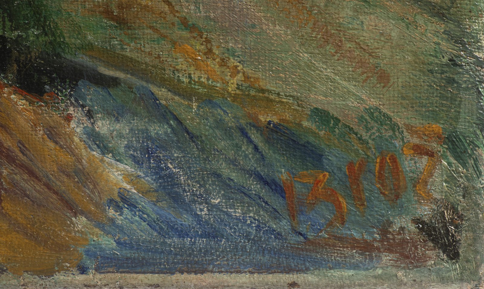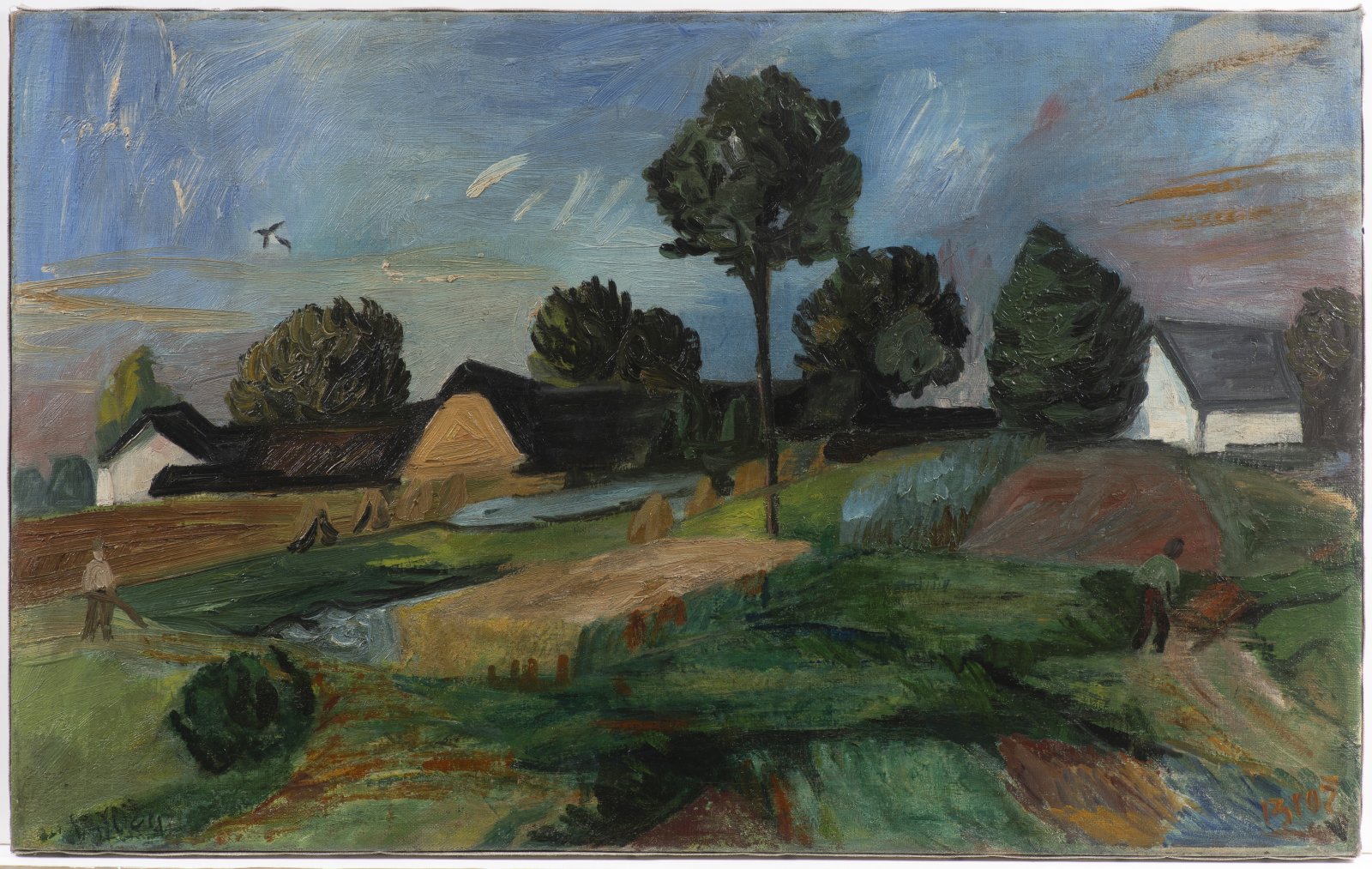 In his time, Josef Brož was perceived as an excellent landscape painter and figuralist. He studied at the School of Applied Arts in Prague with Hofbauer and a year later in Paris with František Kupka. He painted the Czech landscape in the late summer of 1947 with piles of straw and a house martin flying in the sky. The range and density of colors, which he places on the canvas in the spirit of the expressionist tradition, emit the evening calm in the landscape and create a meditative impression.