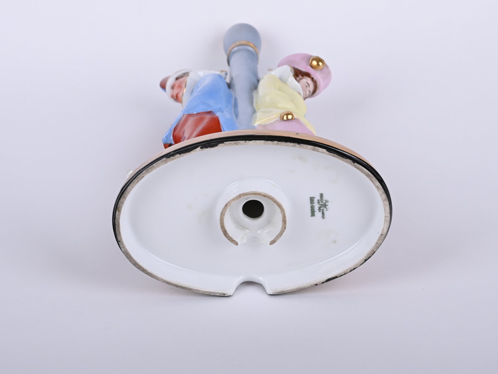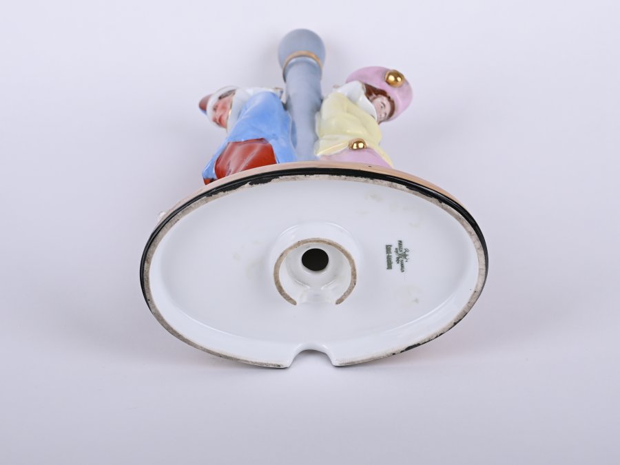 Torso of the lamp with two pierots resting on the original leg of the lamp.