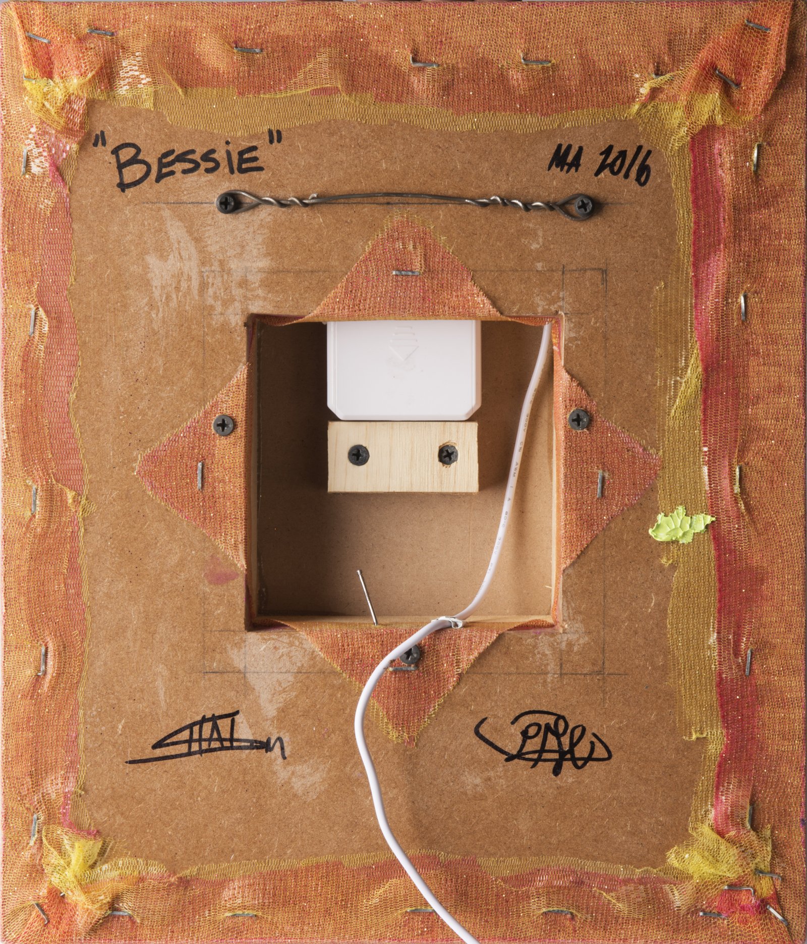 An assemblage from the America series of portraits, inspired by the novel by Franz Kafka. A series of faces – Evelyn, Norman, Lulu, and here, Bessie – represent archetypes of Americans, created from modeling clay, acrylic paint and found objects from children's toys and consumer articles, items left behind by our consumer society. Neuman calls his work "fusion art". Each portrait has its own voice installed on a sound chip or mp3 player. The combination of colors and used materials evokes a very eccentric visual impression, presenting the world in its current twisted form, a form which absolutely must be corrected. Massive consumption, toxic waste, ethnic prejudice, hate, and heaps of useless objects that our culture produces day in, day out. Although the title indicates a specific direction, America is not the only target. Although Neuman sees in it the cause of all misery, he turns to the entire world, which perilously finds itself beyond any control. Born in Prague, Shalom Neuman has lived in New York since 1980. Most of his family were killed at Auschwitz; his family and was later forced to emigrate from Communist Czechoslovakia in 1948. He received his MFA in painting and sculpture from Carnegie-Mellon University, and completed a post graduate fellowship in painting and sculpture at Indiana University. A complete series of portraits could be seen in Prague, largely at the National Gallery in 2011. His works are also represented in private and public collections around the world, including the National Gallery in Prague, Guggenheim Museum in New York, Musée d'art moderne et d'art contemporain in Nice and Buenos Aires Museum of Modern Art. His internationally acclaimed work is filled with irony, paradoxes and satire. As Neuman explains, "As an artist I want to bridge the existing barriers between all disciplines such as painting, sculpture, light, sound, performance theater, video and digital art. I want to make these individual disciplines indecipherable from one another, creating a multi-disciplinary and multi-sensory environment ..."