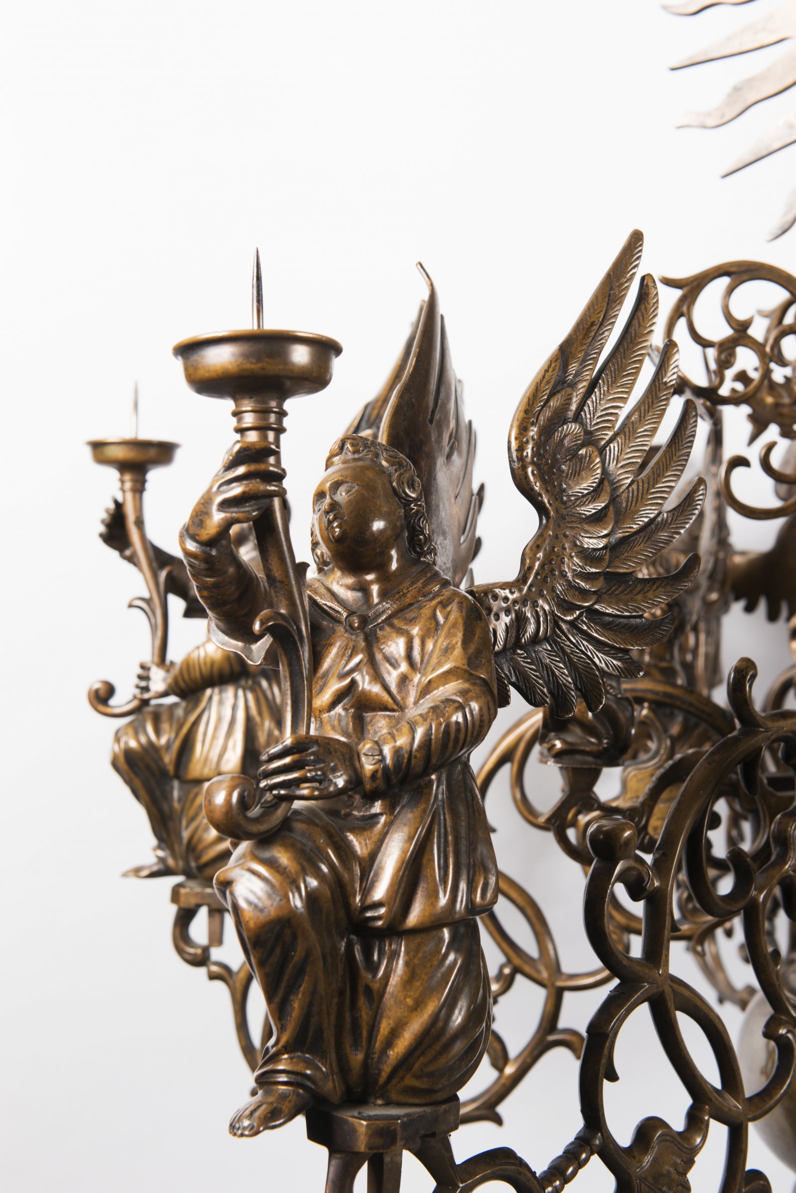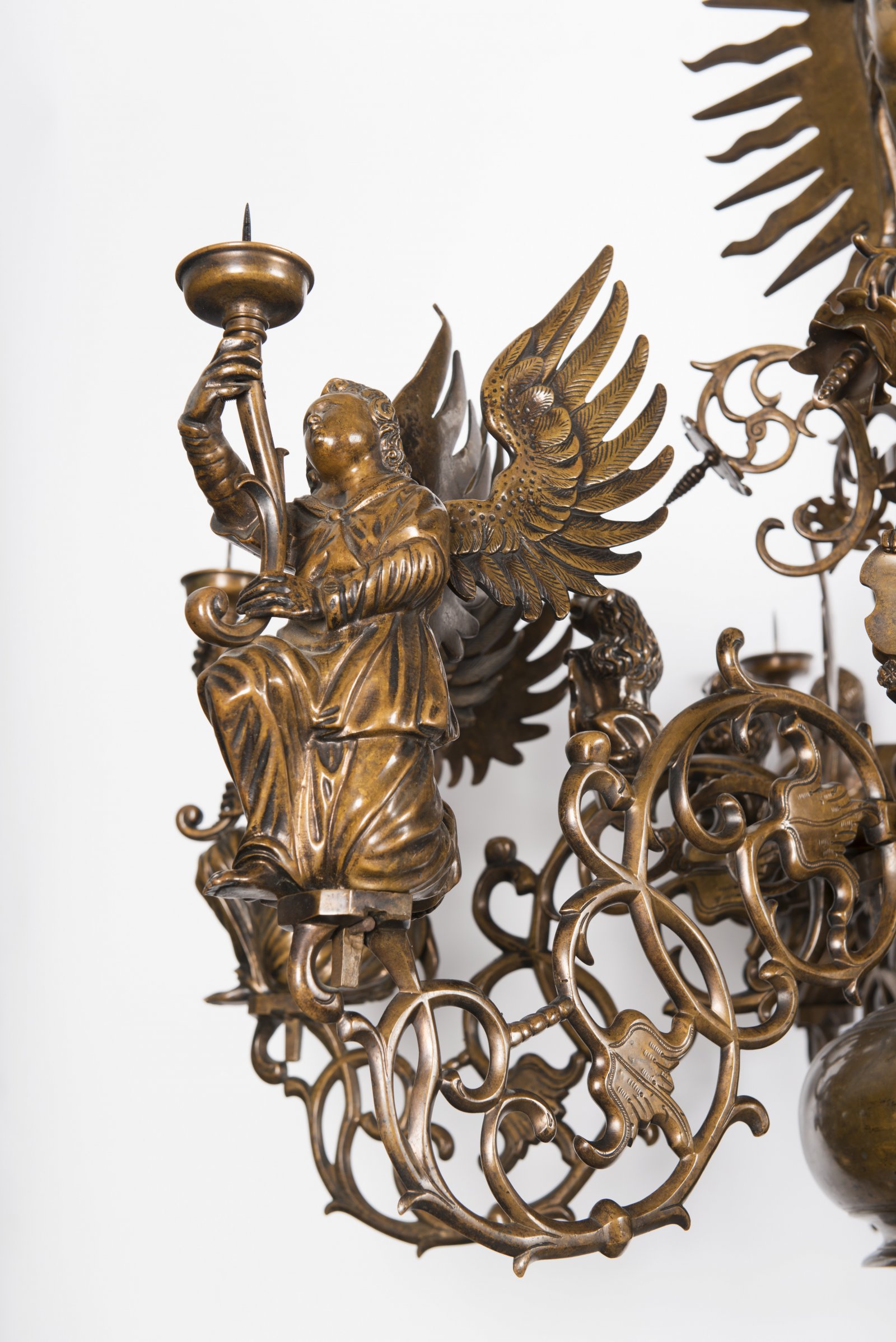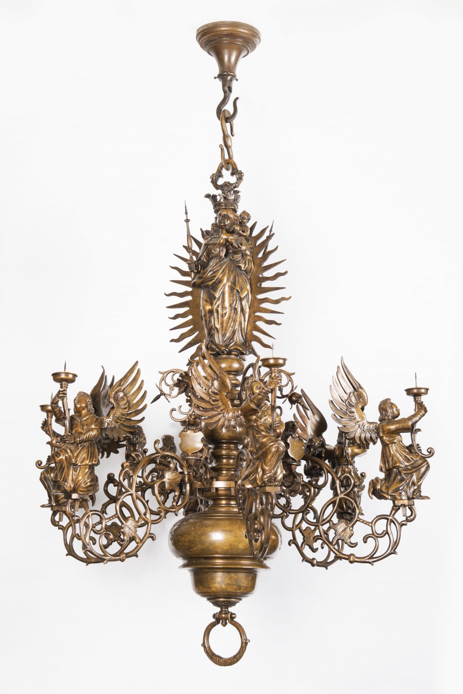 This exceptional Mannerist six-arm chandelier continues the artisanal tradition of beautiful Gothic chandeliers that were made in the southern Netherlands and southern Germany in the 15th century. The top bears a Madonna and Child and six arms with angels holding candles. It has also been compared to one of the most famous examples from this period in the Swiss parish church of Stans. The concept of figural decoration, however, already belongs to the late Renaissance examples in Germany. The beautiful rounded elements and the dynamic drapery of the Virgin's mantle are reminiscent of 16th-century South German goldsmithing. The angel's extravagantly modeled wings are here contrasted with more stylized Gothic figures. The decoration of the arms is also reminiscent of the design of a quite extraordinary chandelier by the Nuremberg late Renaissance goldsmith Christoph Jamnitzer from 1610 (Metropolitan Museum of Art, New York, inv. no. 2012.136.728). Provenance. Albert Figdor, Vienna, until 1930 Georg Kronenbitter, until 1968 Kunsthandlung Julius Böhler, 1968 Prof. Dr. Joachim Wetsger, Berlin Sotheby's London, 10 December 2004 private collection, Oslo, Norway Published in the catalog The Collection of Dr. Albert Figdor (1843-1927), Vienna, Erster Band,1930.