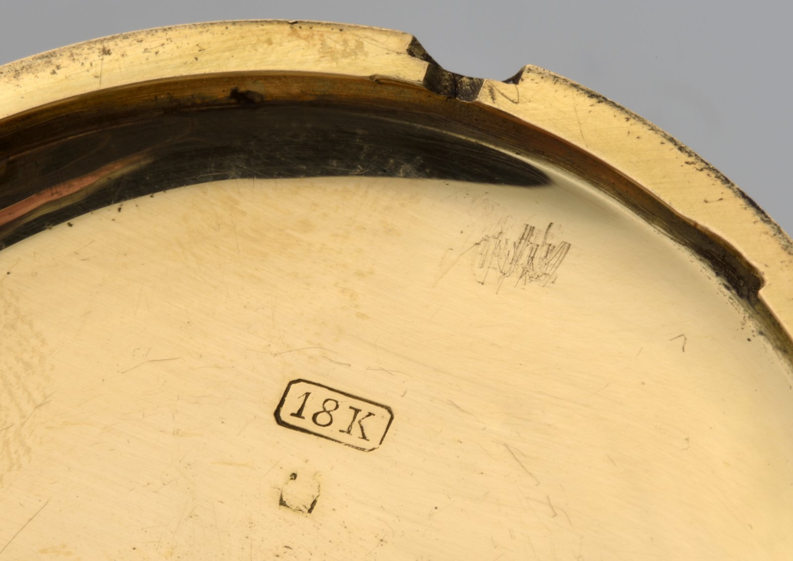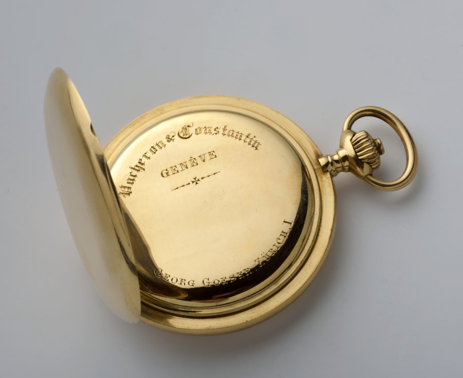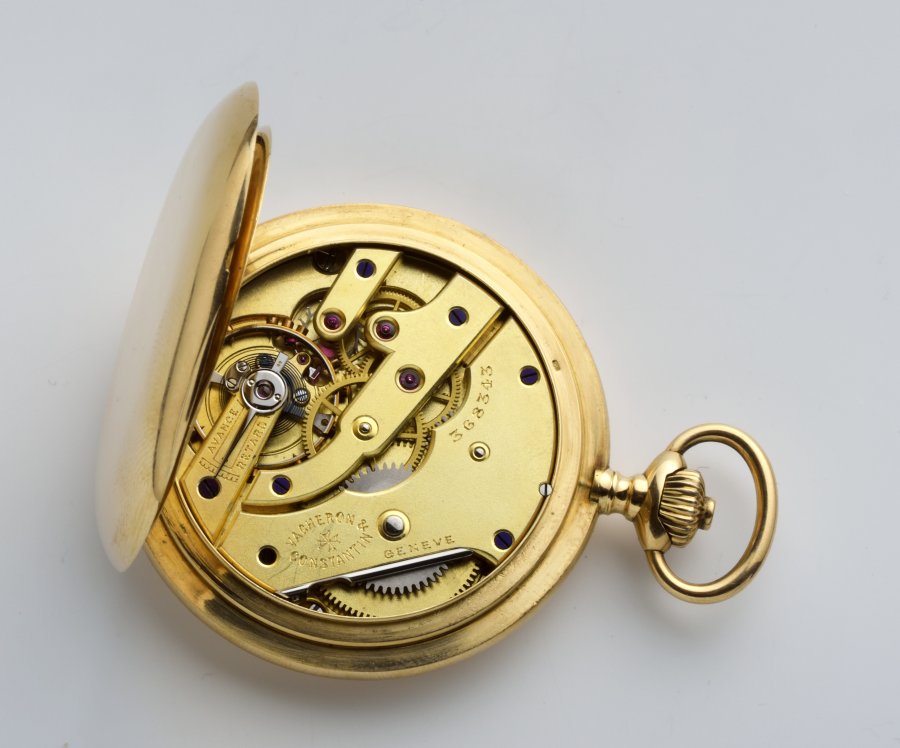 A man's triple-case pocket watch marked Vascheron Constantin Genève. Clockwork no.: 368343. Case no.: 227512. Diameter: 50 mm. Case: 750/1000 gold, engraved with the monogram AZ, signed, gold cuvette. Dial: enamel with Arabic numerals and a small second hand, gilded spade hands. Movement: bridge, gilded, wolf tooth winding wheel, gold compensated balance wheel, screwed chatons.