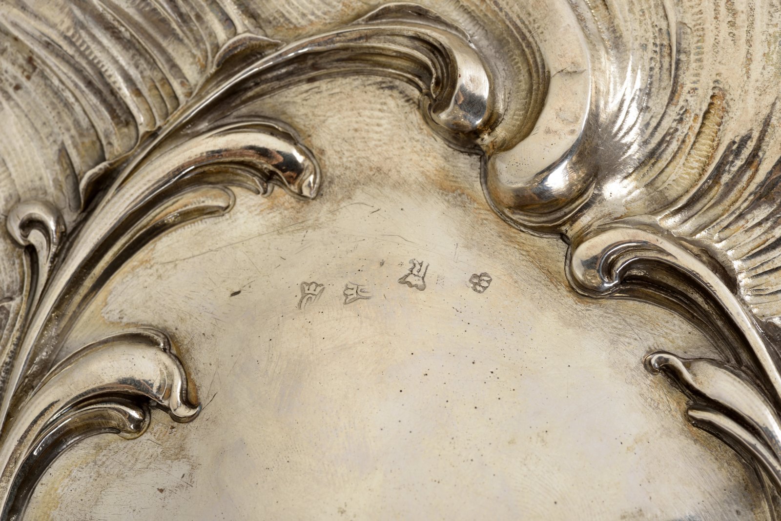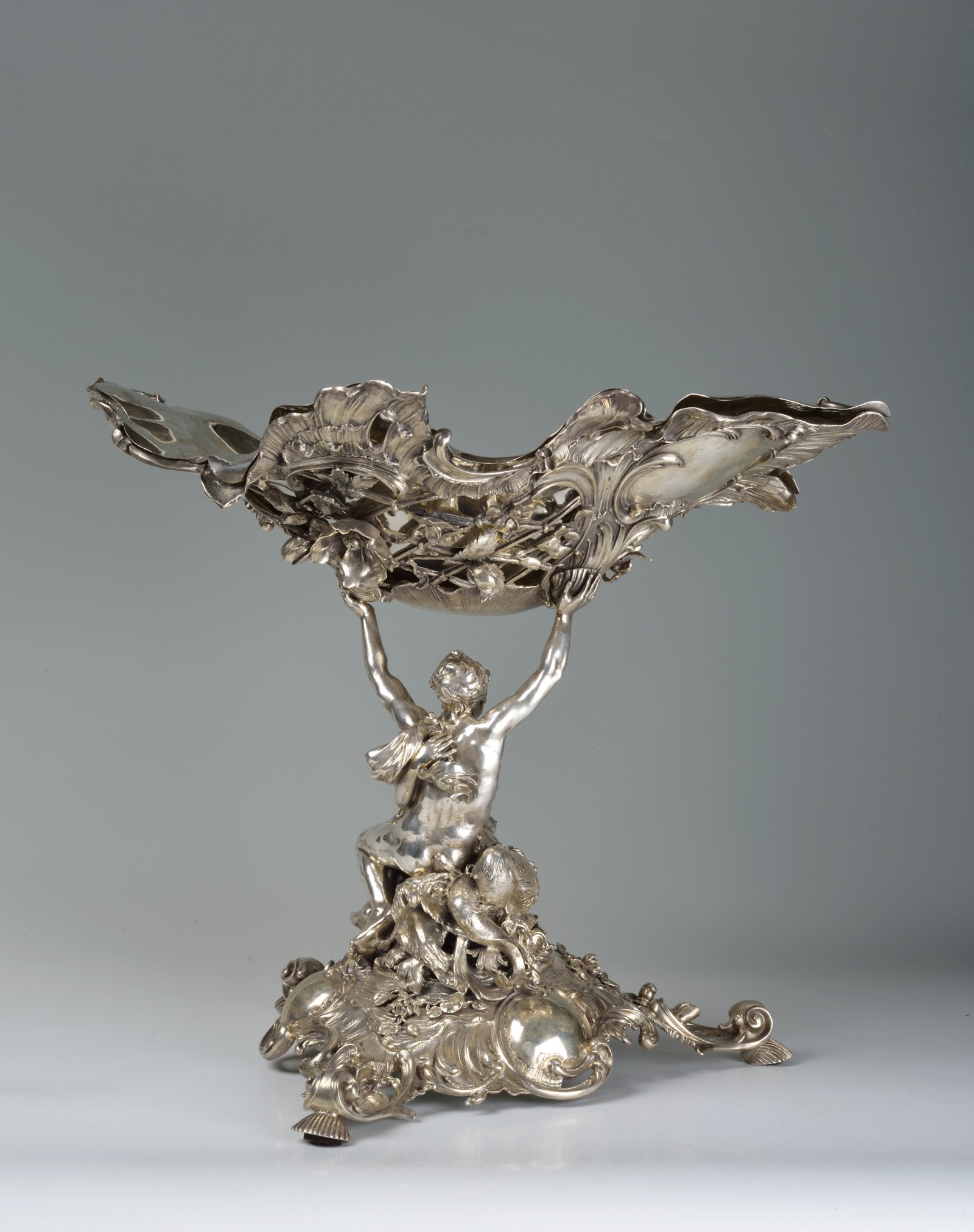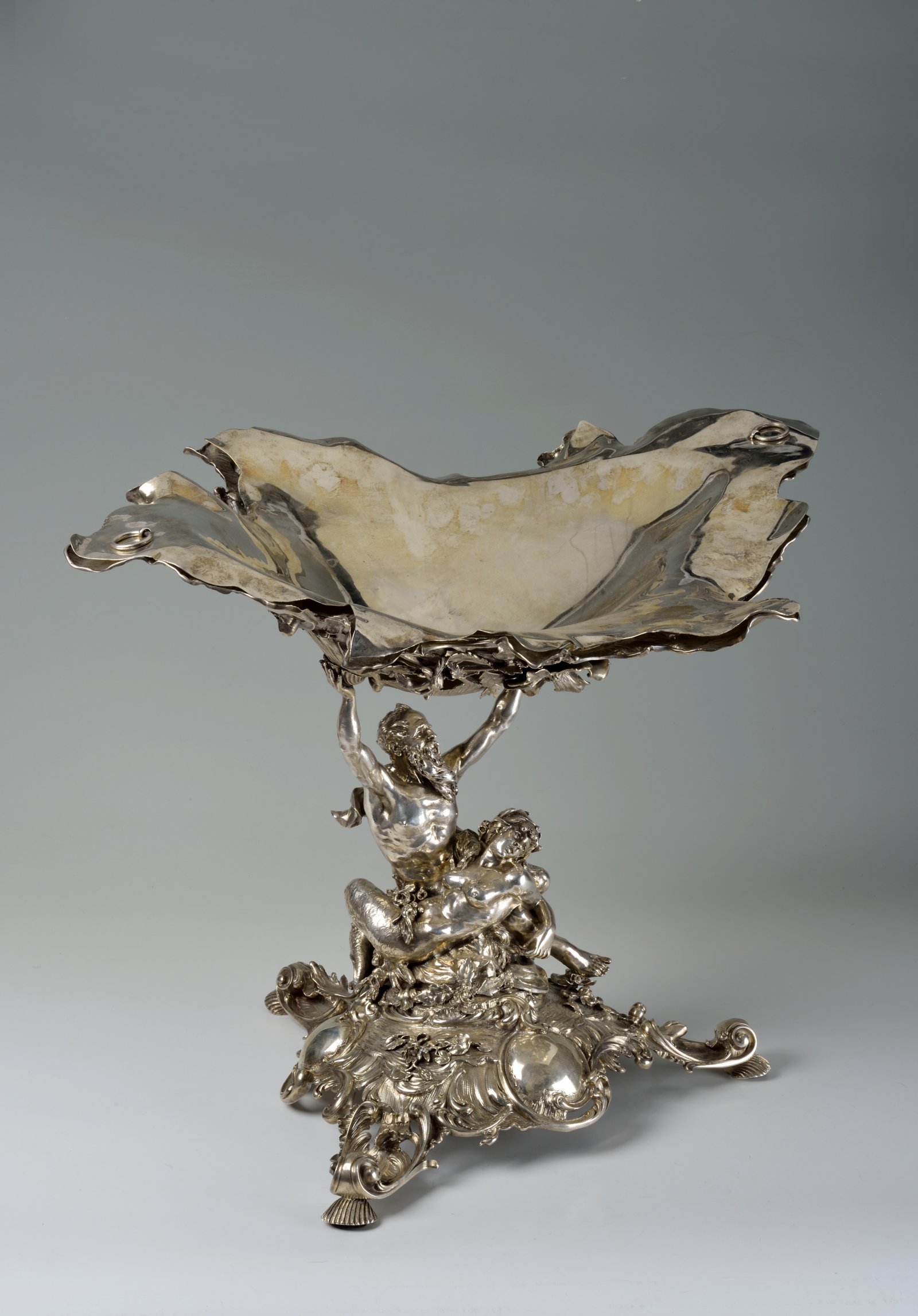 A Neo-Rococo silver bowl. Poseidon, embraced by a water nymph, rises up from a richly decorated triangular base and holds a stylized conch with a removable plain metal bowl over his head. 812/1000 silver.