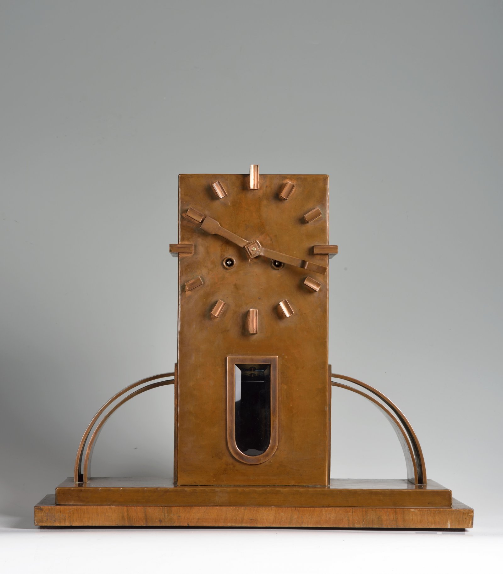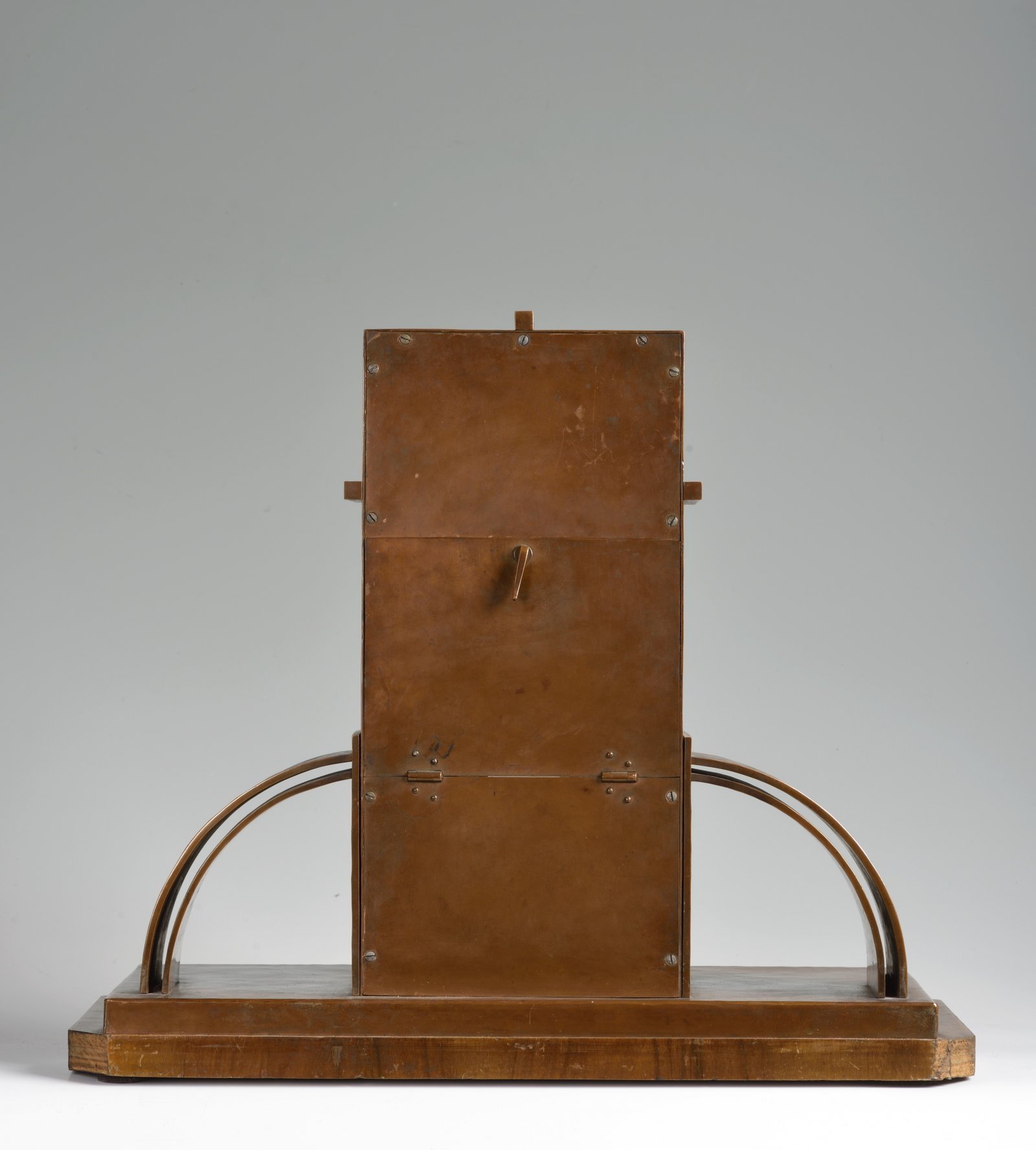 Hammered copper, wooden base. Probably made by the State School for Applied Metalworking Arts in Hradec Králové.