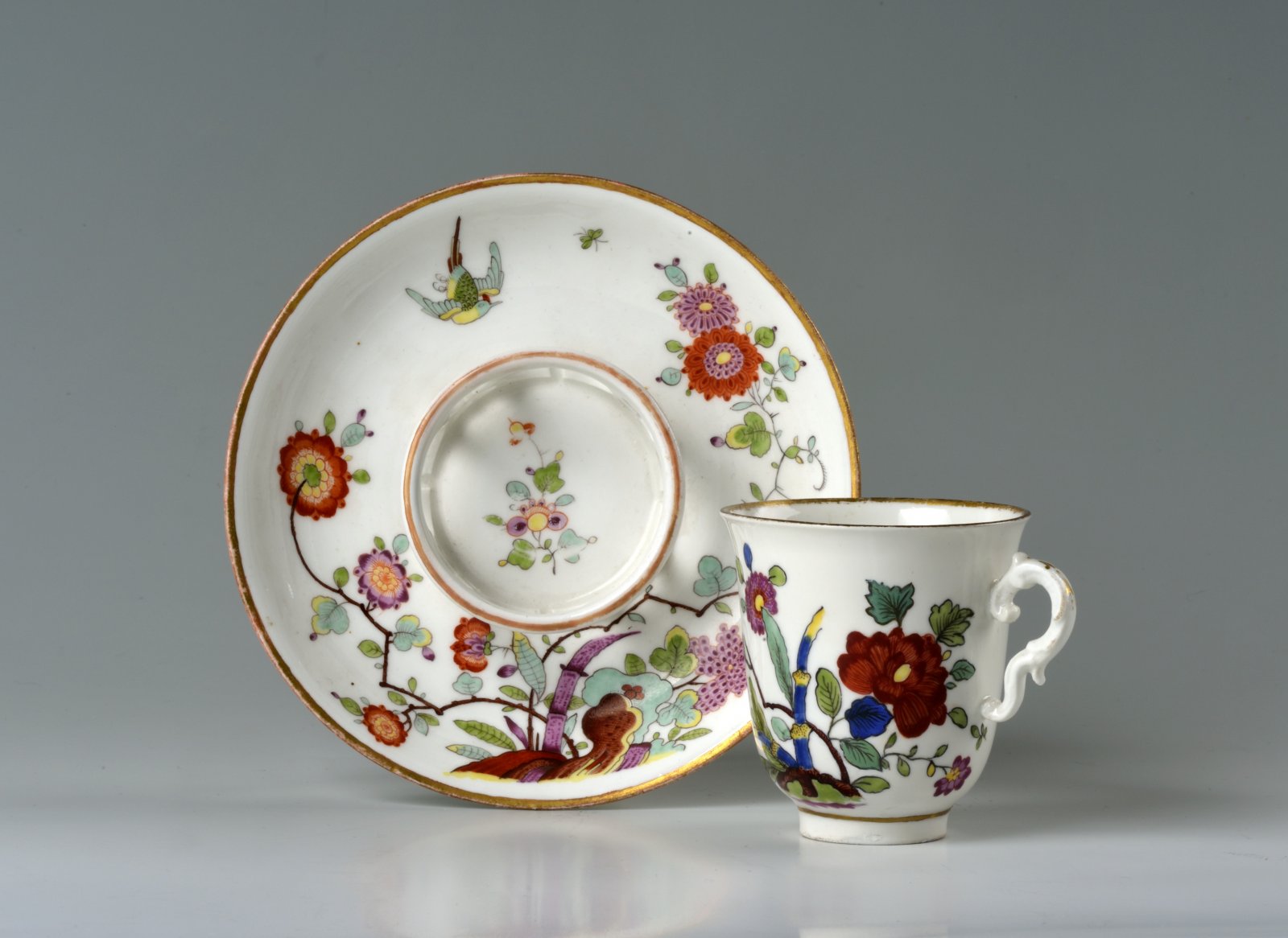 Trembleuse cup and saucer with a floral decor of Indian flowers against a white background. Mark impressed into saucer, blue underglazed mark on cup. Imperial porcelain workshop.