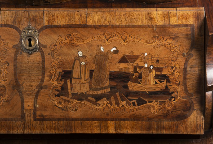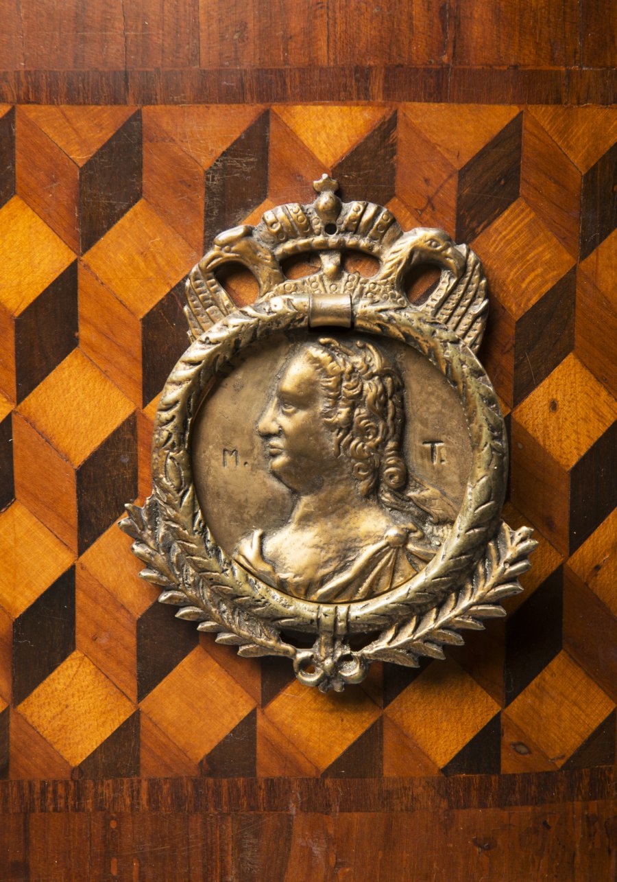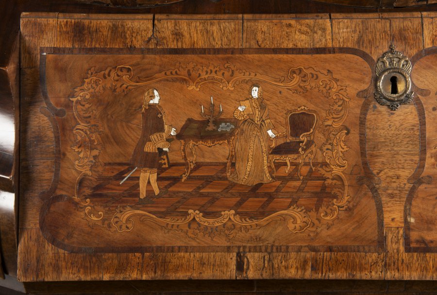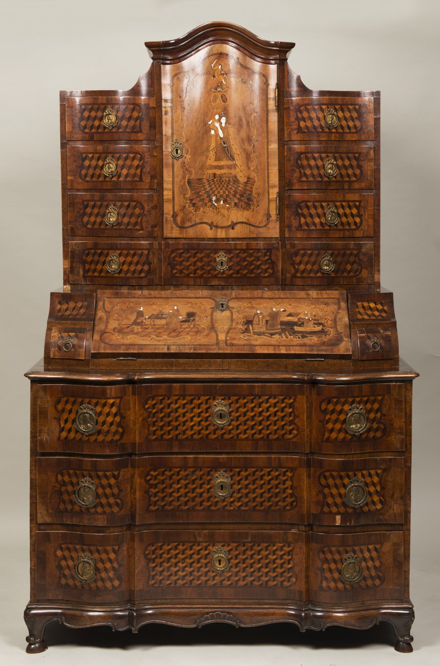 Richly decorated Baroque secretaire with geometric trompe-l'œil inlay featuring various types of wood and ivory. Maria Theresa carrying a child (Joseph II) in a royal cloak and crown is depicted on the top center cabinet door. The center section features other figurative scenes. The faces of the figures are inlaid with ivory. The secretaire features three drawers below the abattant and three drawers on each side of the upper cabinet. Original condition, including the brass mounts bearing reliefs of a head in profile and the monogram "M.T."