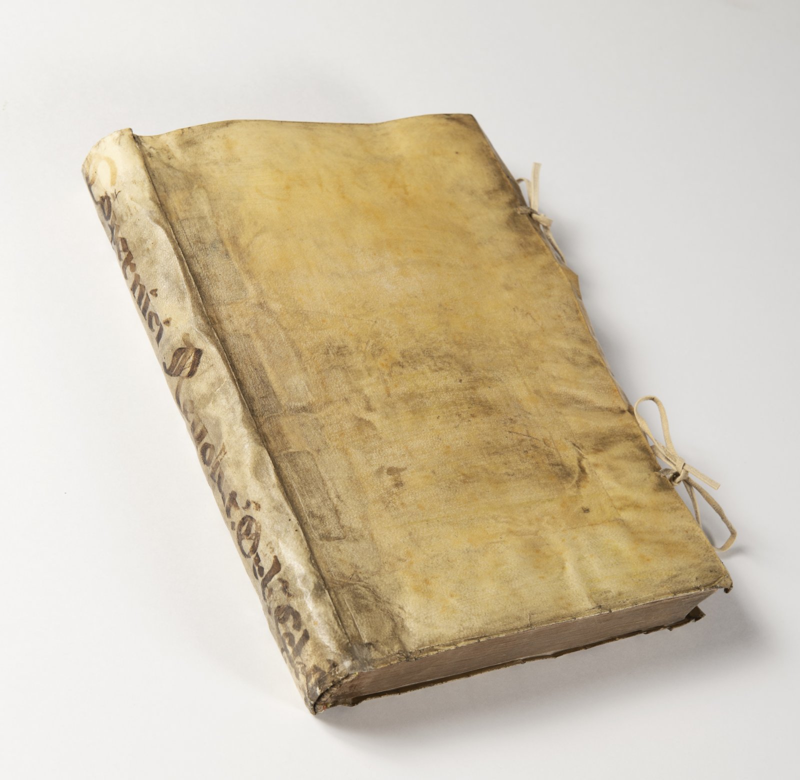 Sheet 27 is erroneously paged 32 and sheet 73 as 65, just like other known copies. Historical flexible parchment binding with hand-written title on the spine; leather bands from a later date.