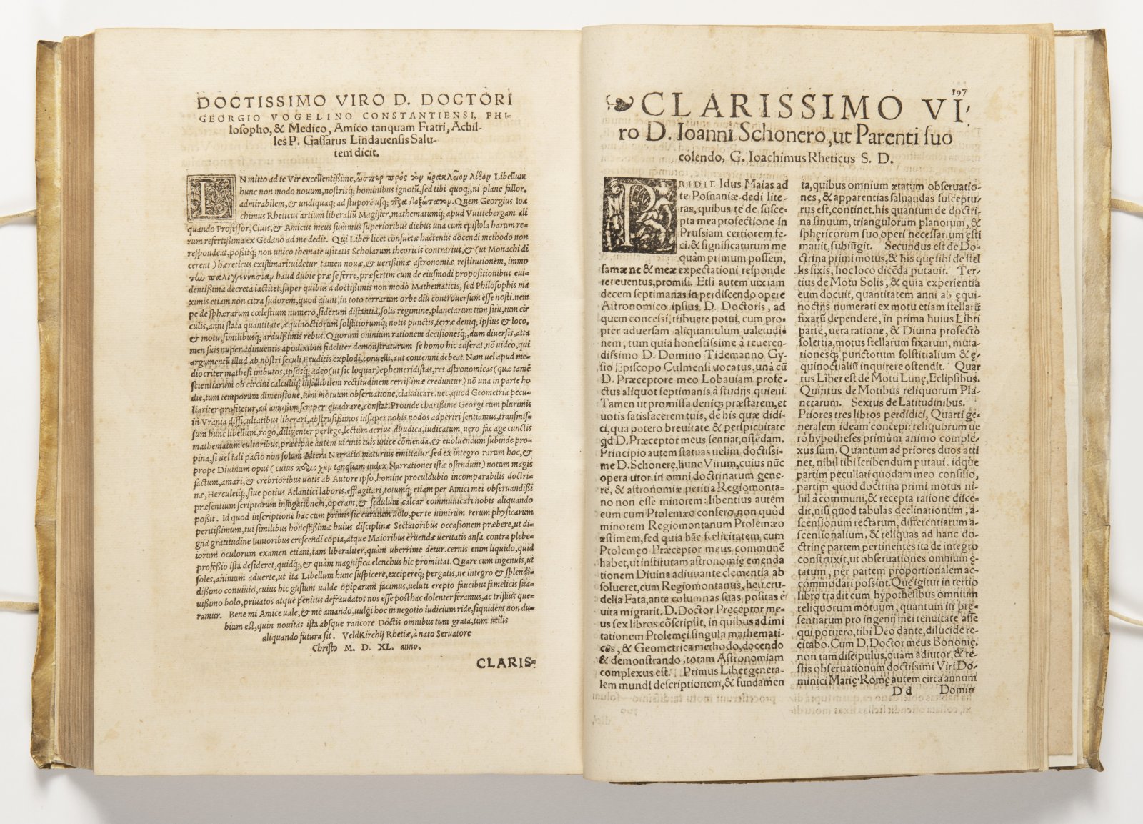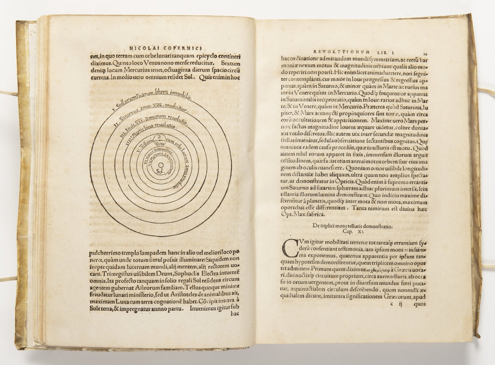 Copernicus’ “On the Revolutions of the Heavenly Spheres” concludes the thousand-year-long supremacy of Ptolemy’s geocentric system. It places the Sun in the center of the universe, as this model corresponds better to the measurements and observations that long failed to explain the phenomena in the skies. According to the heliocentric principle, the planets are spheres that revolve along circular paths around the Sun, the center of the universe, while also rotating on their axis, thus describing the surface of a cone. This movement was noted as precise. The text is supported with many exact calculations and tables.