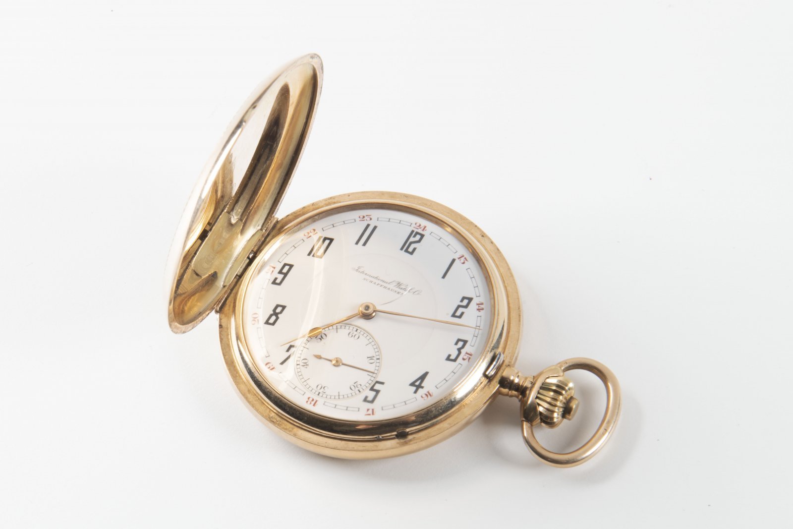 Men's double coat pocket watch marked Schaffhausen. Machine number: 667334. Case number: 789908. Case fourteen carat gold. Enamelled dial with Arabic numerals and minute hand. Great condition.