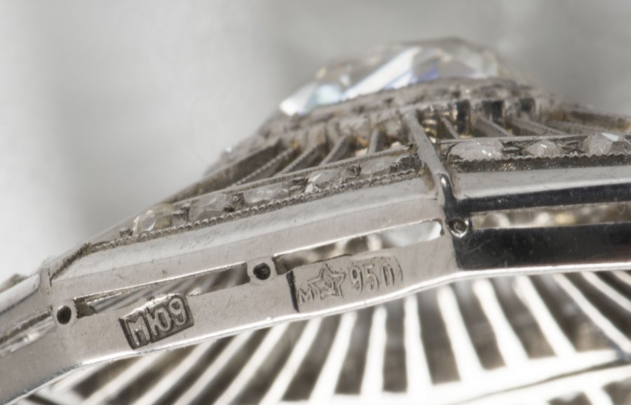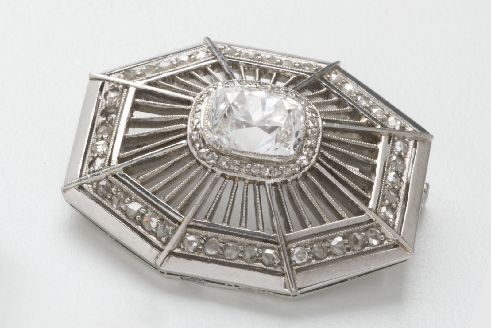 Platinum brooch from the Art Deca period in the shape of a cobweb with the central diamond of the old brilliant-cut 2.00 carats color H, quality VS, the edge of the brooch and around the central diamond set with routing cut diamonds, openings for greater glitter. Purity 950/1000. Punch from below. This is an exceptionally good work of old Russian goldsmiths. Great condition.