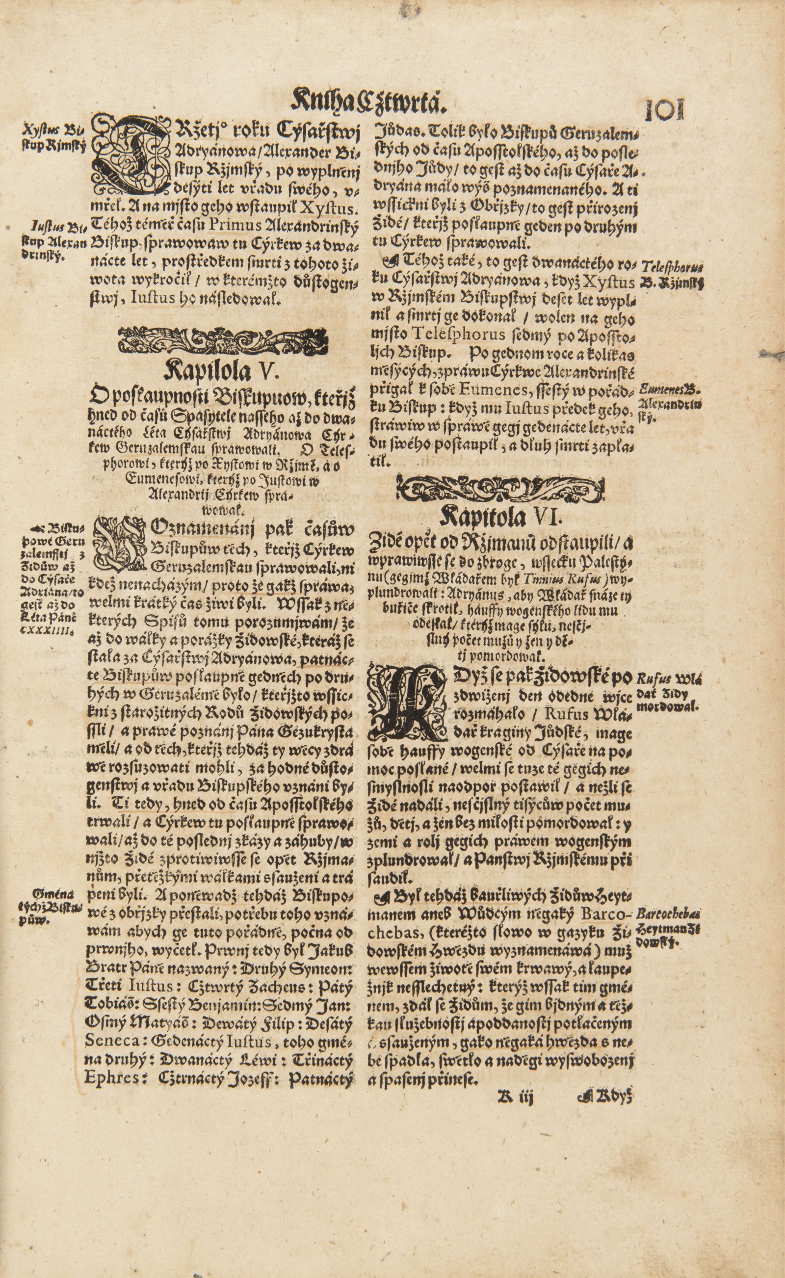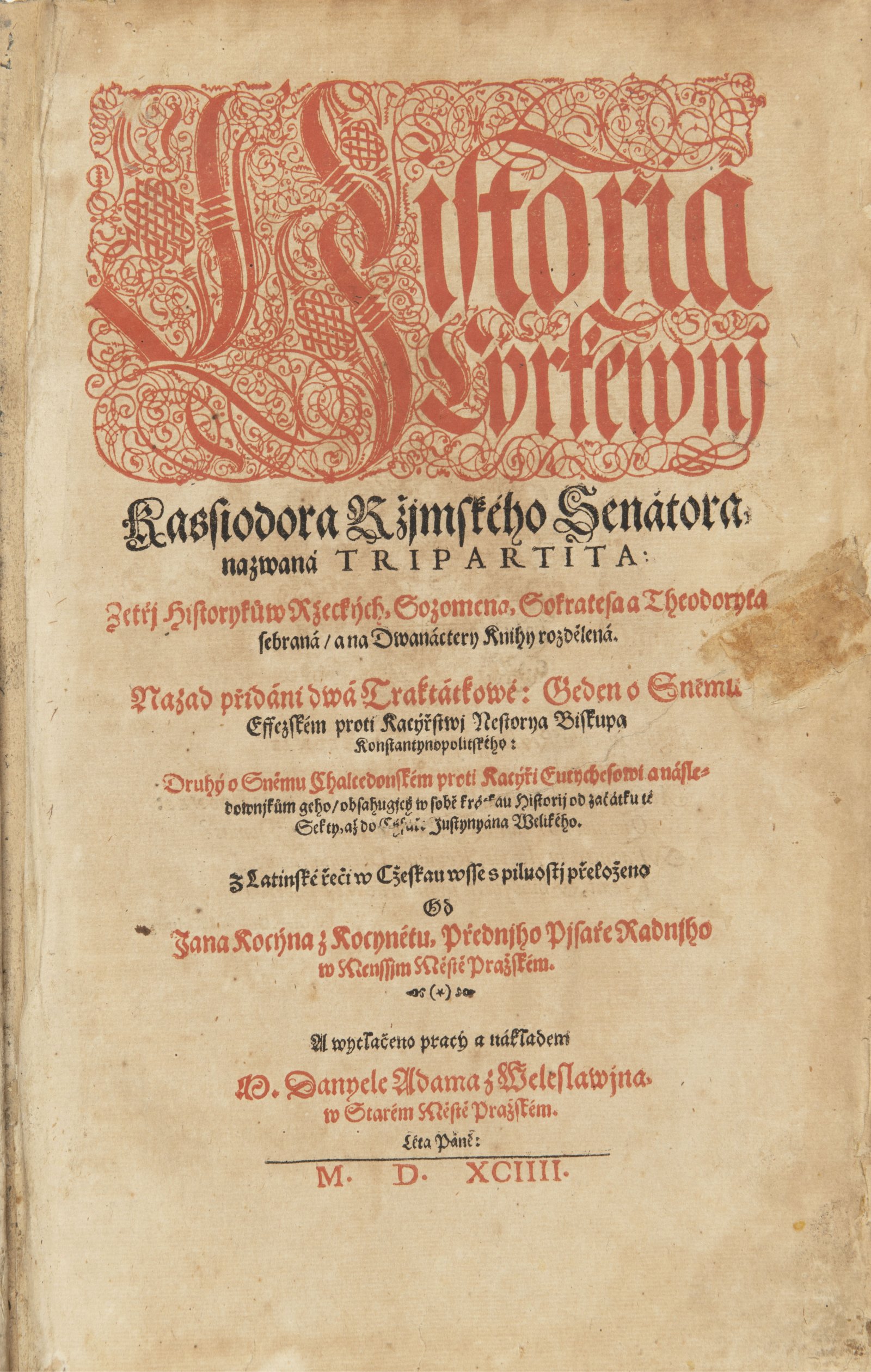 Danel Adam from Veleslavín was a Czech publisher, writer, bohemian, lexicographer, historian, philosopher, translator, organizer of literary activities, humanist and university pedagogue. His activities greatly influenced Czech literature, so the period when he worked is called the Veleslavín period. The title Church History (Historia cyrkevnj Kassiodora Ržjmského Senátor, called Tripartita) was translated from Latin by Jan Kocín of Kocínet. Title page bicolor, title in red woodcut, verso imperial emblem. Two-column printing, woodcut initials, lines. Two printing marks, the second with the last sheet of the period glued to the back parchment. Total: 394 pages, (7) sheets, 624 pages, (8) sheets. 9 sheets continuously are missing. Parchment blind embossing binding dated to 1595, one metal clip out of two preserved.