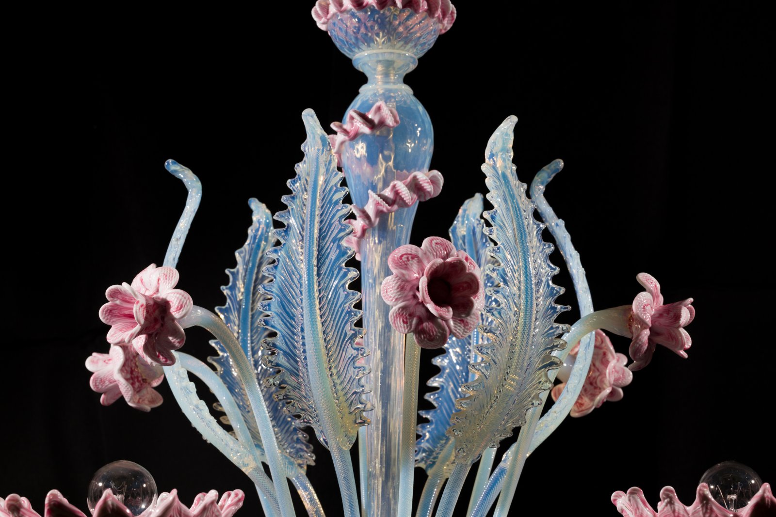 Venetian glass produced by the island of Murano became increasingly popular over the centuries and became famous beyond Italy's borders. Thanks to its long-lasting malleability, Venetian glass allowed the production of complex and richly shaped objects. The chandelier on offer is a typical and high-quality example of this glass production, both in style (floral motifs) and colour. Excellent condition, newly electrified.