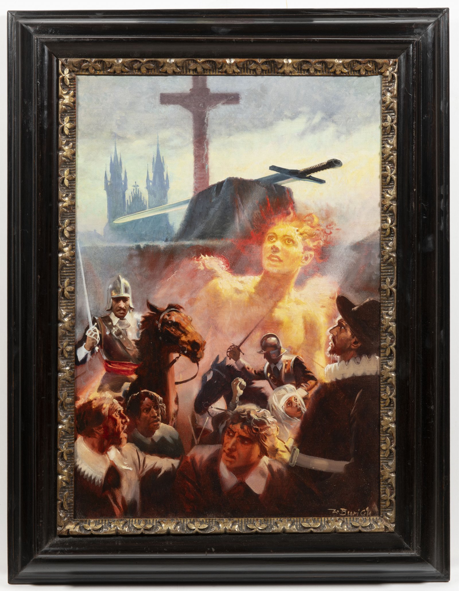 Zdeněk Burian was one of the absolute best in the field of illustration, especially in connection with prehistory and adventure books. As an author, he was extremely productive even during the totalitarian era, with the number of his works probably reaching around 15,000. In this respect, his work essentially became popular and an engaging part of reading. As an author, he had his favorite themes, and it is precisely these adventurous themes full of dynamic twists and turns that are projected into the theme of The Post-White Mountain Era. The central motif is a fiery angel, perhaps an allusion to the apocalypse - the Revelation of St. John - and the executioner's sword of Mydlář, which rests on a stone in front of the cross and Týn Church on Old Town Square. Soldiers with swords surround the lords who are about to be interrogated. The presented work falls into the category of free creation, which included a huge range of themes - from landscapes and genres to realistic portraits, historical events, and allegories. Most of these works are done in oil on canvas, but the range of techniques and subjects is so varied that it is difficult to define the breadth of Zdeněk Burian's work.