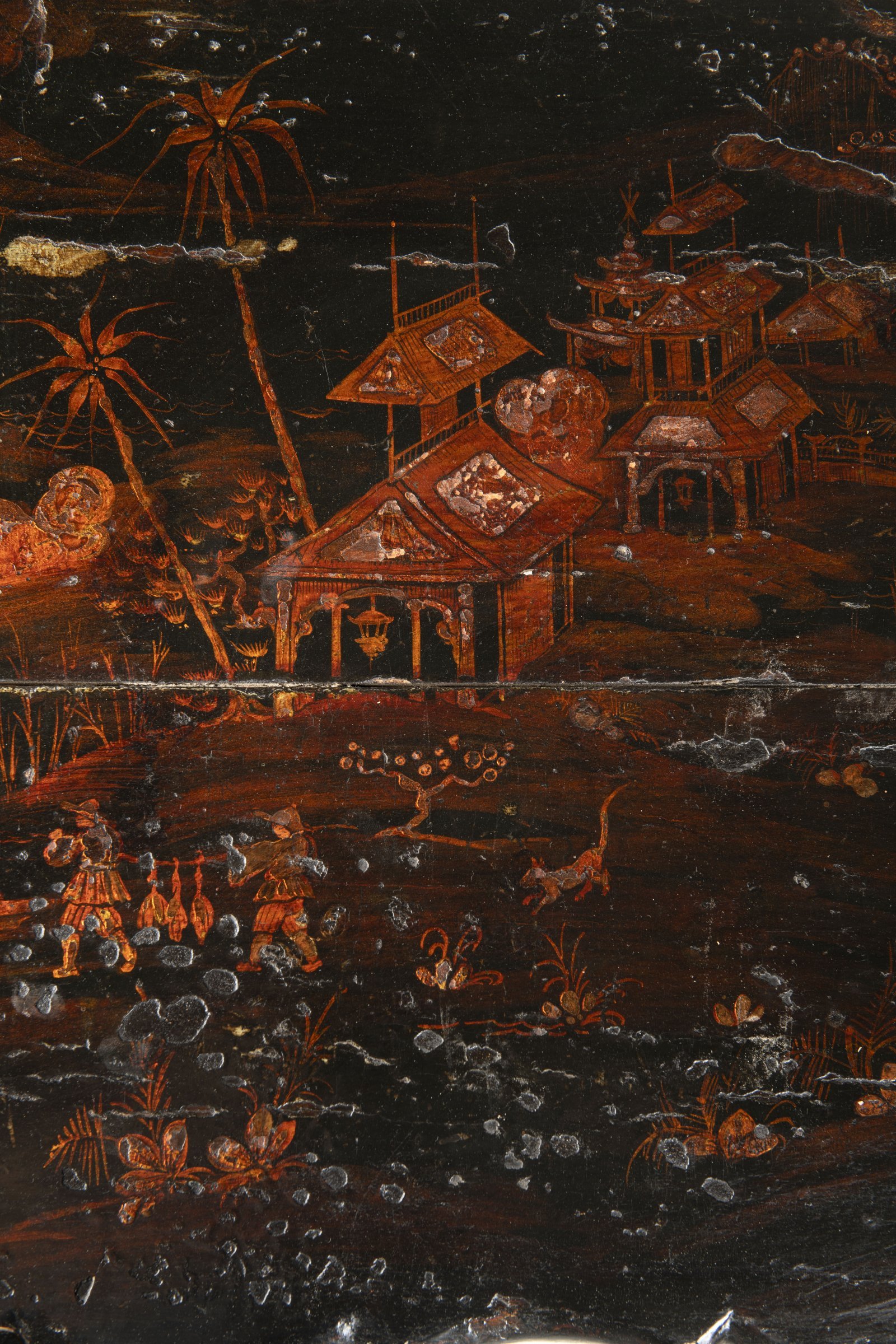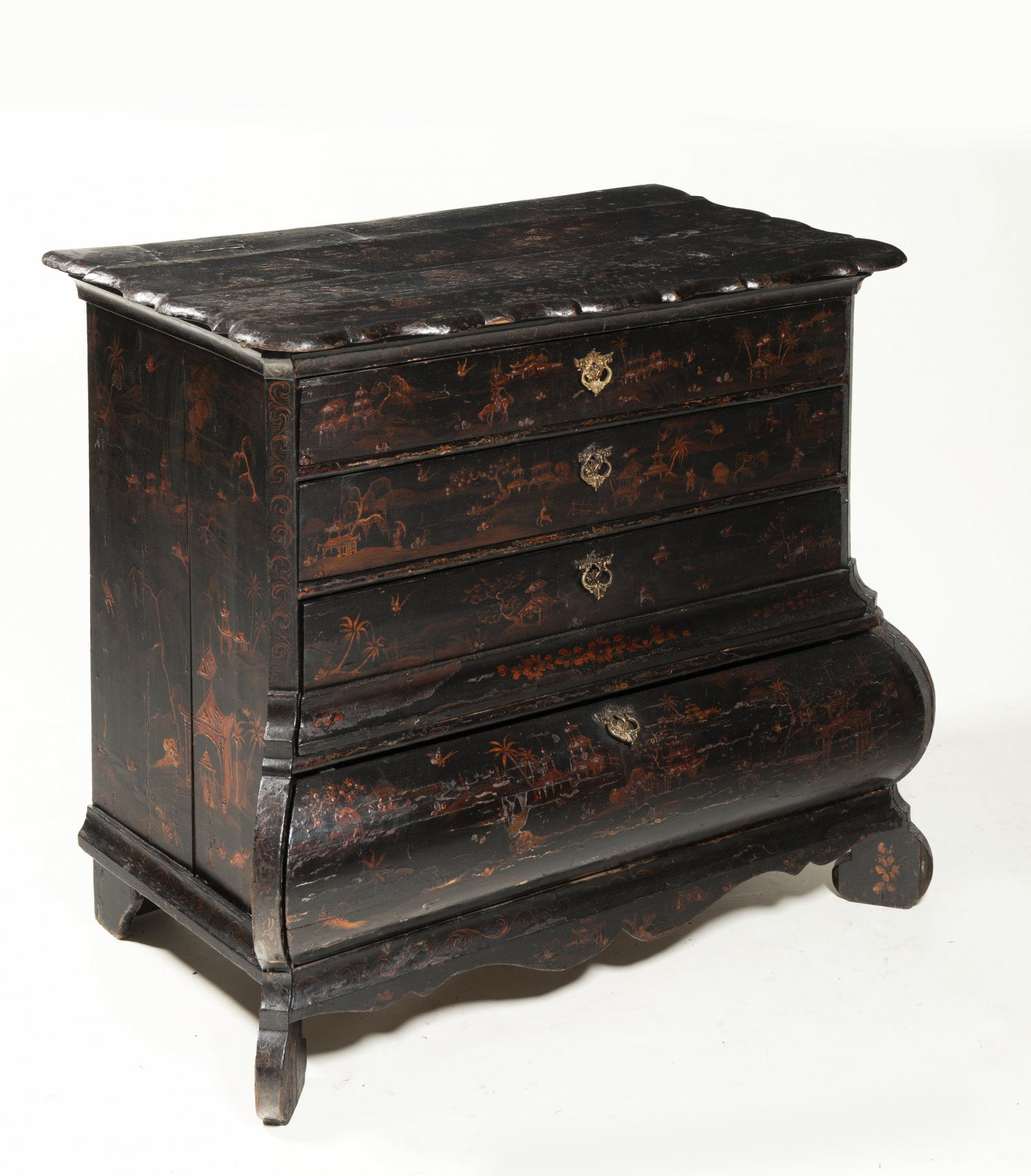Inspiration from Chinese and Japanese art in Europe began with imports from these countries in the 17th century, especially at the beginning of the 18th century, when attempts were made to imitate entire architectural structures (pavilions, pagodas), materials, techniques, and decor. These include, for example, Delft pottery, Meissen porcelain, French Rococo furniture, and painting. This rare black lacquered chest of drawers with chinoiserie motifs has four drawers and depicts scenes of Chinese architecture, inhabitants, fauna, and flora, dominated by fantastical birds, using the technique of impasto lacquer and painting. Good condition with numerous defects.