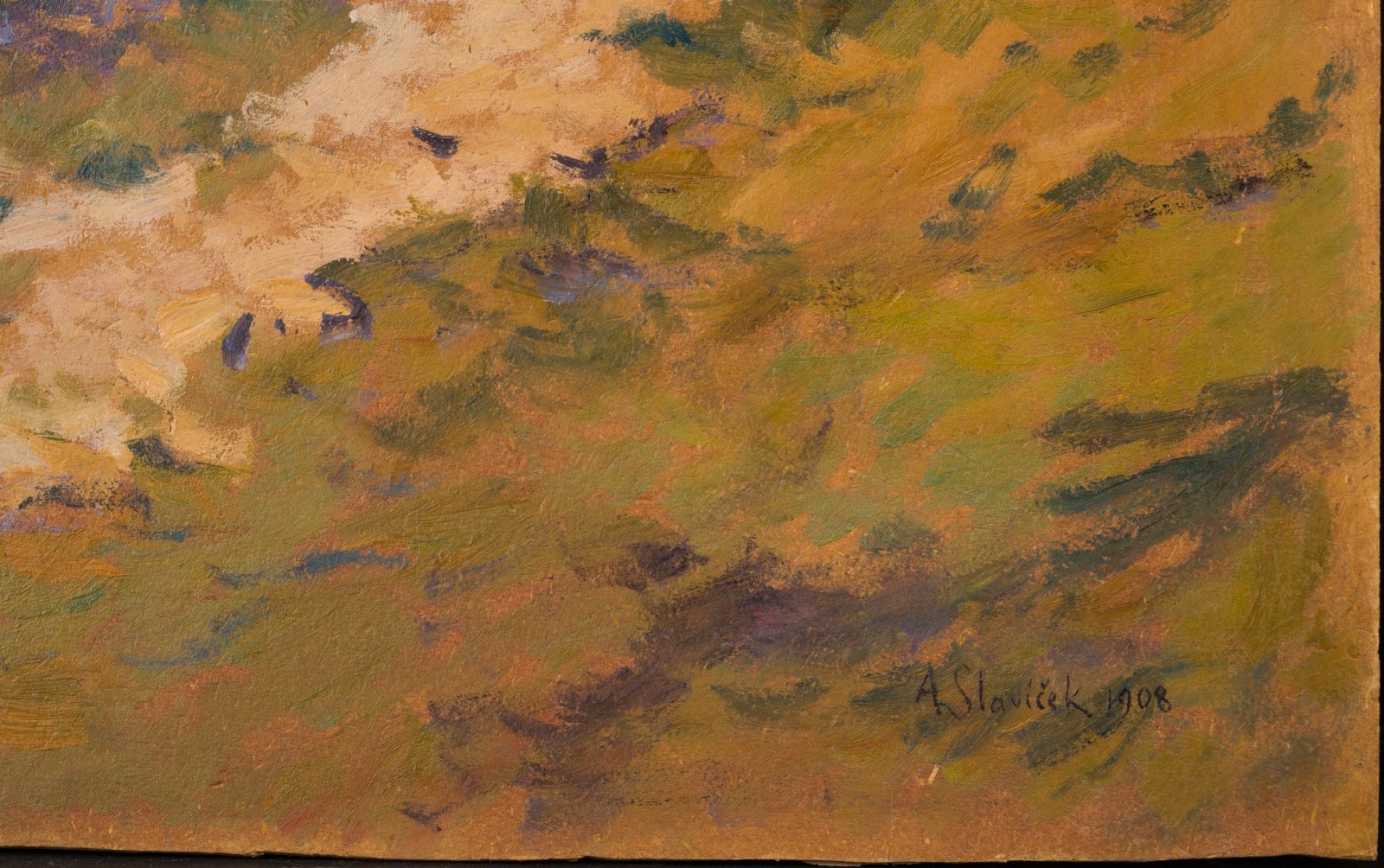 From the expert opinion of Prof. PhDr. Petr Wittlich CSc.: "The painting originates from Slavíček's summer stay in Oldřichovec in southern Bohemia in 1908. Its main motif is a well-trodden crossroads of dirt roads climbing up to a hill on the horizon. This motif is repeated in other paintings from Oldřichovec and becomes the main thematic motif of Slavíček's landscape paintings from the last years of his life. It was in 1908, after painting large panoramas of Prague, that Slavíček underwent an ideological transformation, expressing in his letters that he wanted to paint "historical" landscapes. This is also reflected in his art, as he toned down the stylistic bravura of his previous Impressionist period and sought to give his paintings deeper meaning. The motif of a road rising to the horizon is a clear symbol of this program."