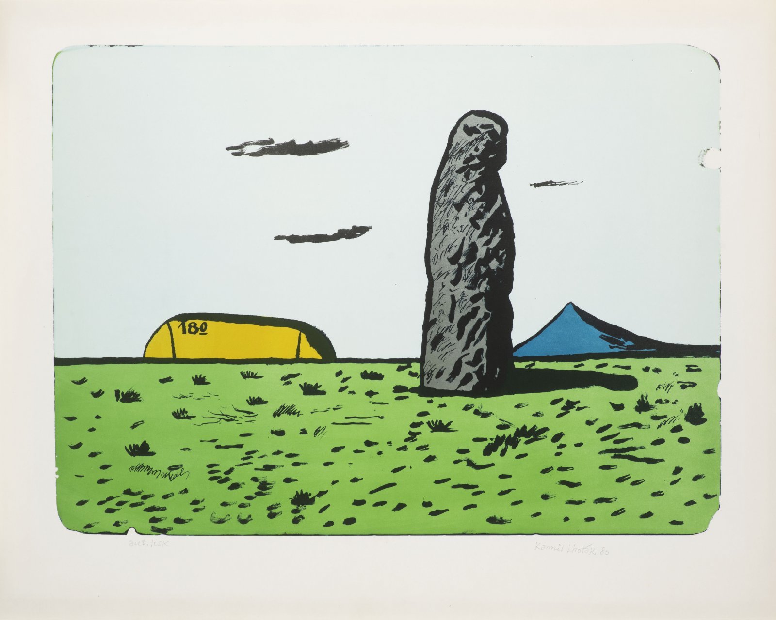 Lithography captivated Kamil Lhoták with its artistic essence and the possibility of translating all details into the final work. He observes the clash between modern attributes and natural elements and places great emphasis on color, which has become increasingly prominent since the 1960s. Author's print.