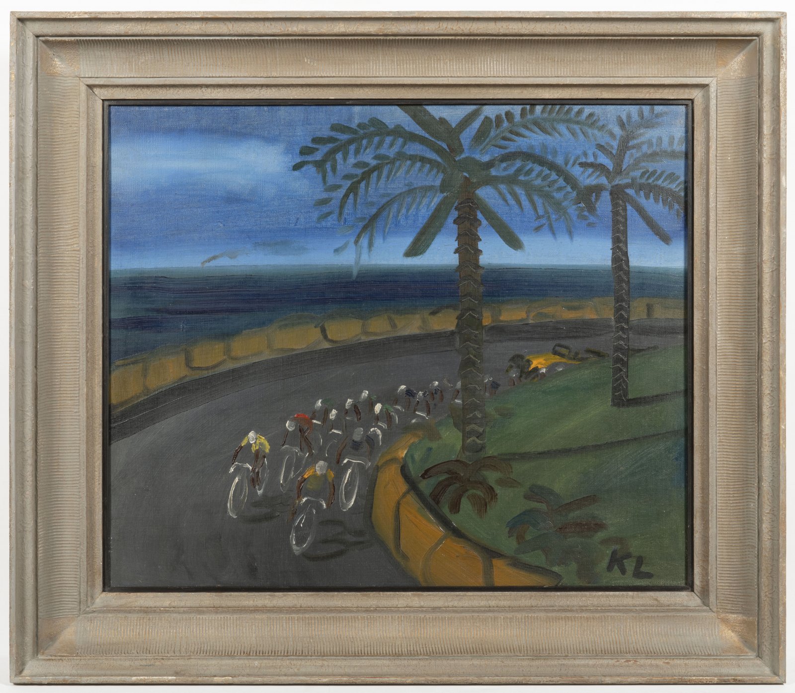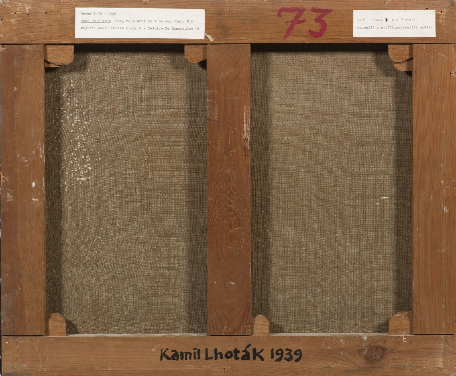 Kamil Lhoták's early work represents an important milestone in the artist's development. Barely half of his earliest works from 1937 and 1938 have survived. The year 1939, when Lhoták's focus shifted from studying law to artistic creation, was a fruitful one for him, and he actively improved his painting technique. The year 1939 was also a turning point due to an exhibition at the Beaufort Gallery, where members of the Umělecká beseda (Artistic Society) took notice of Lhoták's work. Contemporary critics praised Lhoták's original range of themes and concepts. Otakar Mrkvička, a respected critic, said that even he would choose something here for the walls of his apartment, "and we professionals are not easily impressed." Kamil Lhoták was subsequently invited to exhibit at the Umělecká beseda. This rare work from Kamil Lhoták's early career comes from the collection of Czech artist Ivan Steiger, where it remained for several decades. The central motif is the pinnacle of Lhoták's beloved cycling - the Tour de France. The motif of bicycles and cyclists first appeared in 1939 and was subsequently repeated periodically. Enchanted by exotic palm trees and the sea horizon, he painted a peloton of cyclists on the French Riviera with a few confident strokes and recorded the last Tour de France for the next seven years, when the war put an end to this cycling festival.