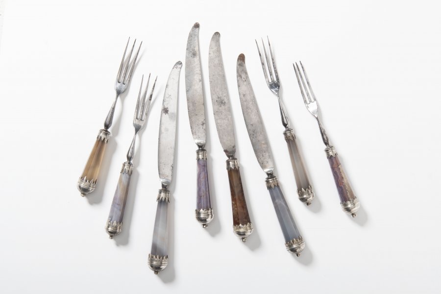 The Baroque cutlery set consists of eight pieces with handles made of German agate set in silver mounting. The faceted handle with engraved decoration in la régence style. literature: Amme, Historische Bestecke, Stuttgart 2002, no. 317, ff. For the silver passart, see Banker, Alte Bestecke, Munich 1978, no. 190.