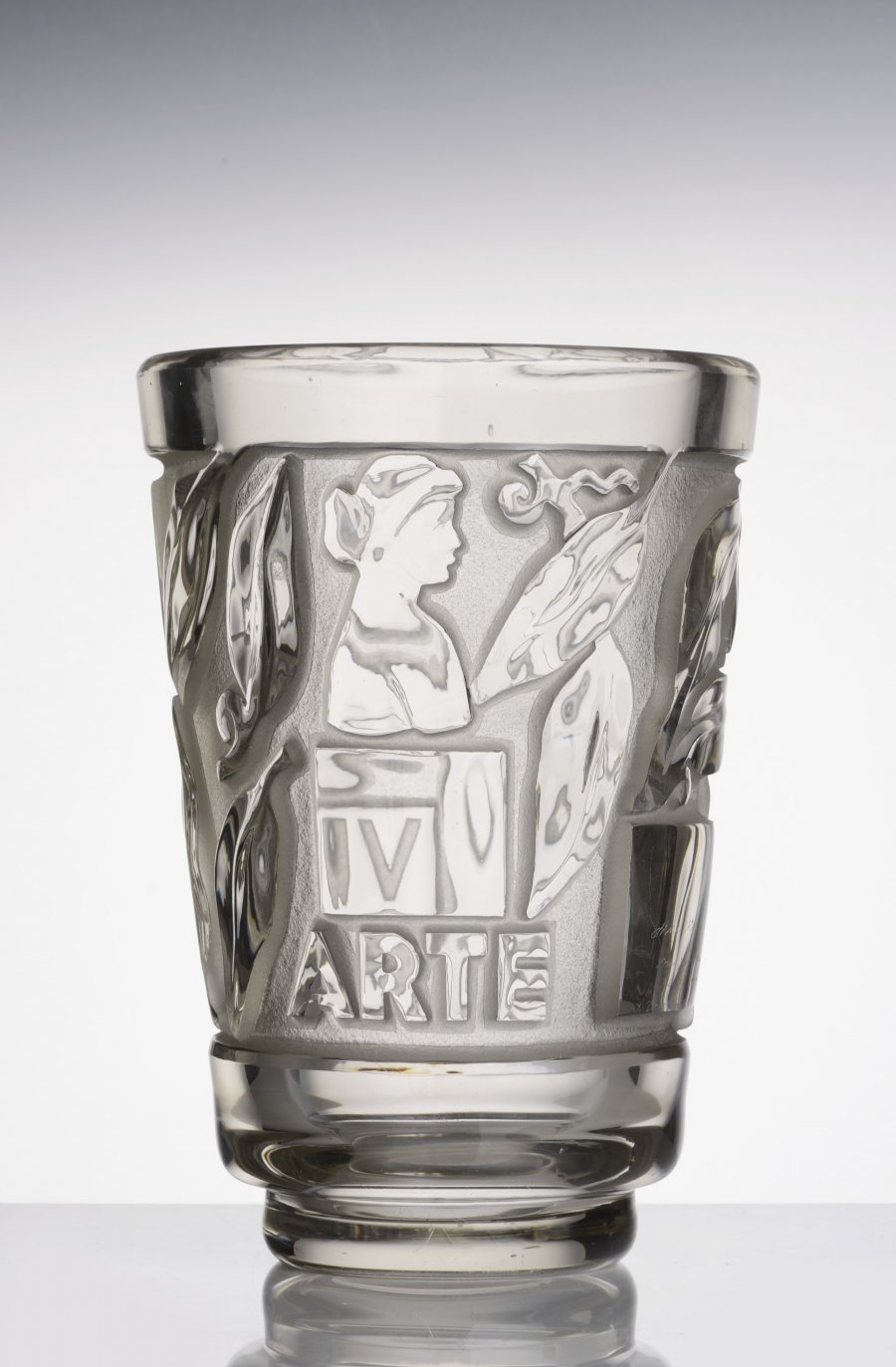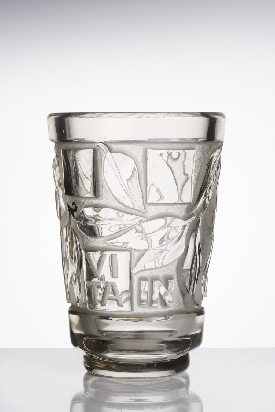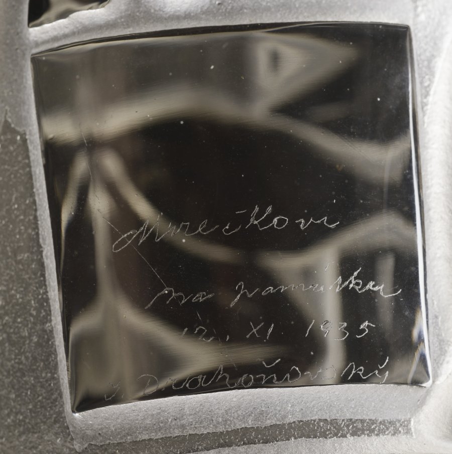 Robust glass vase with relief motifs of female torsos, leaves, tables and the inscription VITA IN ARTE engraved into the glass. On one of the inscription panels, dedication and signature: to Mireček in memory of J. Drahoňovský, 12.XI. 1935. The author's dedication is addressed to his only son.