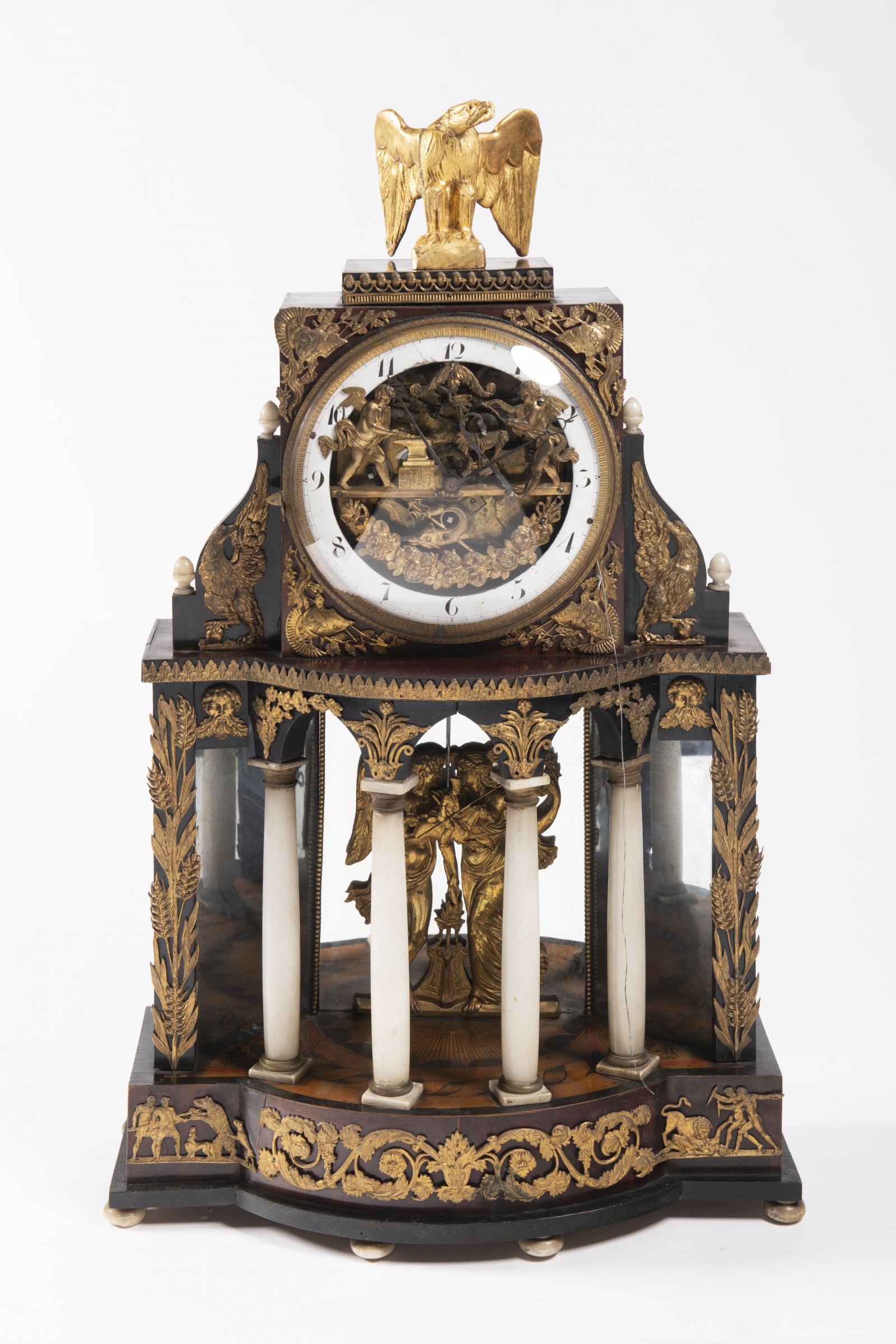 Impressive Empire master of the house table clock in exceptional quality with quarter movement and automaton (grinder and blacksmith). On a mahogany base richly decorated with gilded brass is placed a quartet of alabaster columns. Below them, a richly decorated base in the schwarzlot technique. Glazed dial with enamel surround with Arabic numerals. On the top with a carved eagle in gilded wood. Good condition, machine to be adjusted, working movement.