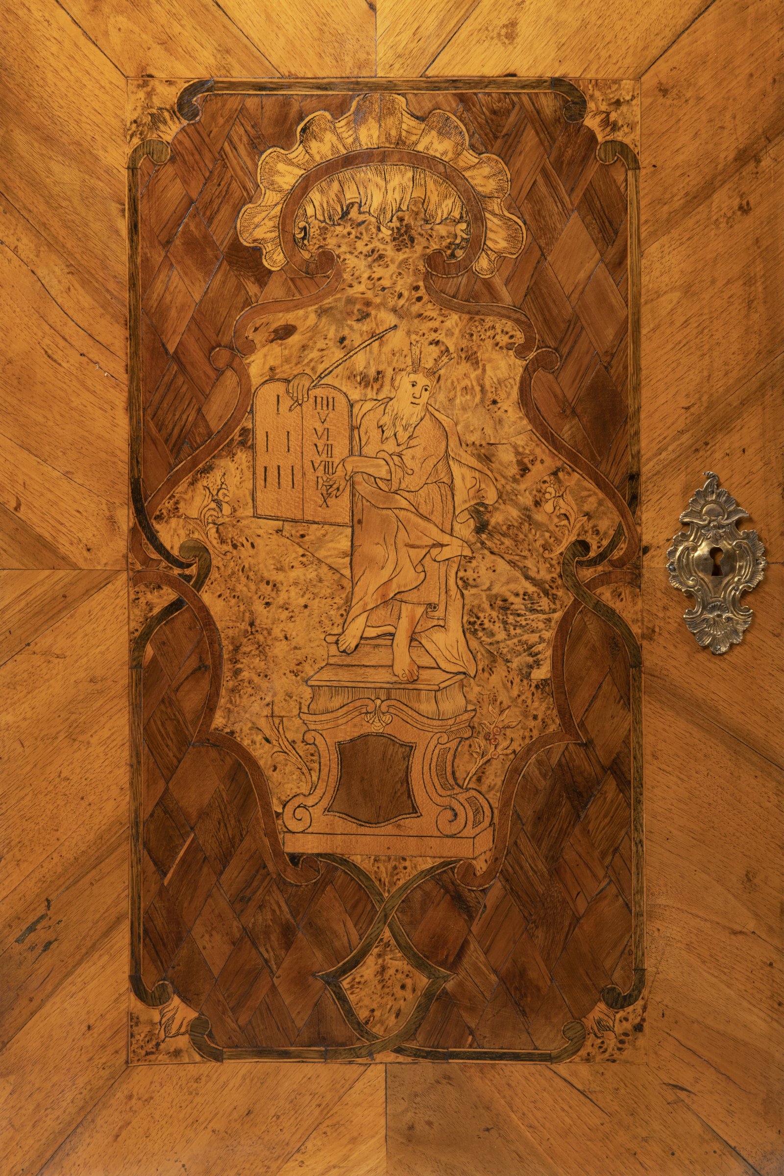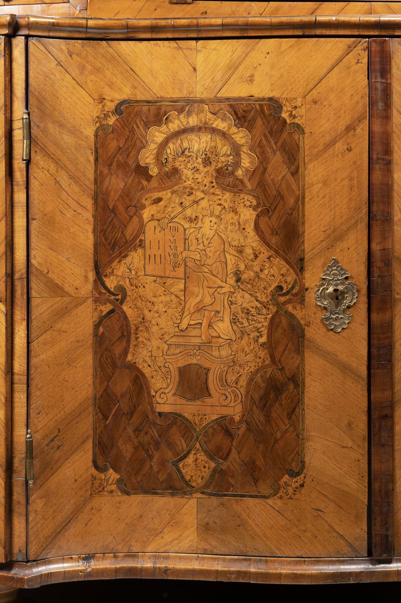 An exceptional Baroque tabernacle depicts four inlaid figures from the Old and New Testaments (along the upper part of St. Matthew and St. John) and on the sides with figural inlays with two oval-framed musicians. On the left and right side, ingenious slide-out book stands, drawers below them. Inside the tabernacle, there are four drawers with an elongated secret box. The lower door depicts Moses inlaid in a maple spice with framing finished with a fan-shaped Baroque decor. Original fire-gilded fittings. This unique furniture consists of the most representative pieces of its time, probably designed by the famous Baroque architect working in the Czech lands, Kilián Ignác Dientzenhofer. Original state.