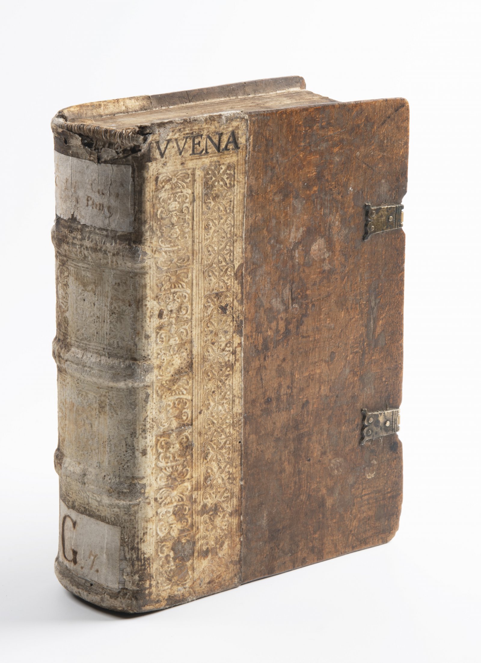 rare collection of 4 post-incunable editions of works by classical authors by two important book printers. Very rich small period marginals directly in the text and on the edges in sepia and black ink, ownership and library notes on the combs and the last sheet verso. Wide leaf edges, extensions missing. Period semi-parchment early renaissance blind-print binding on 3 original ligaments over wooden boards. "IVVENA" embossed on the upper left, library labels on the spine.