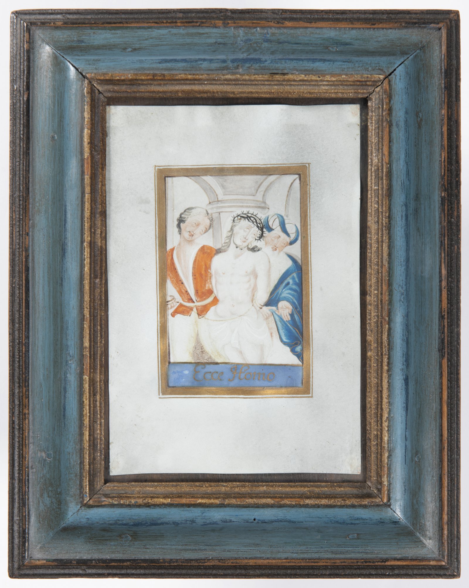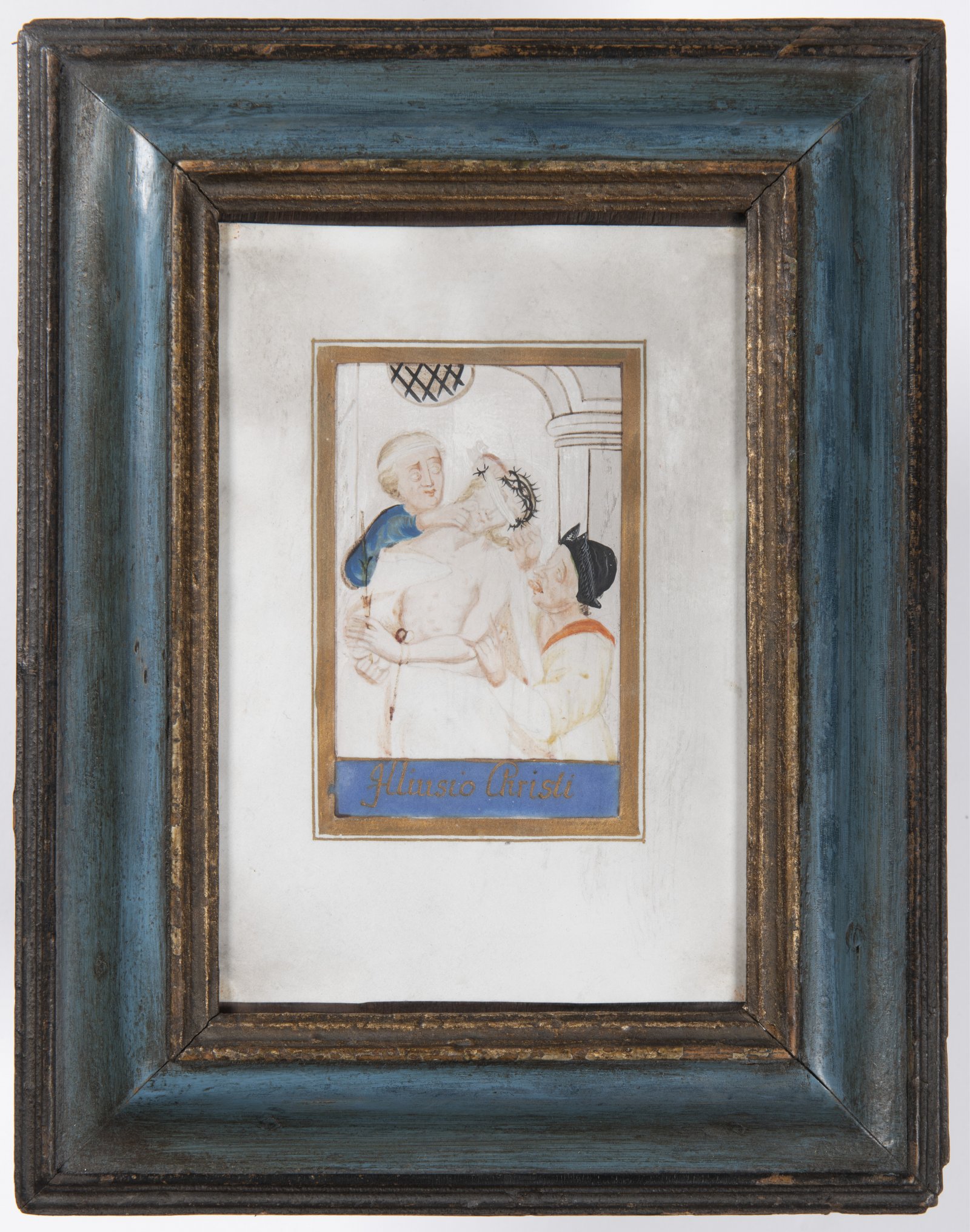 A rare Gothic pair of drawings on parchment with the motif of Jesus Christ "behold a man - the illusion of purity". The scene takes place before the crucifixion itself, when the caricature characters mock him and crown him a savior with a symbolic crown of thorns.