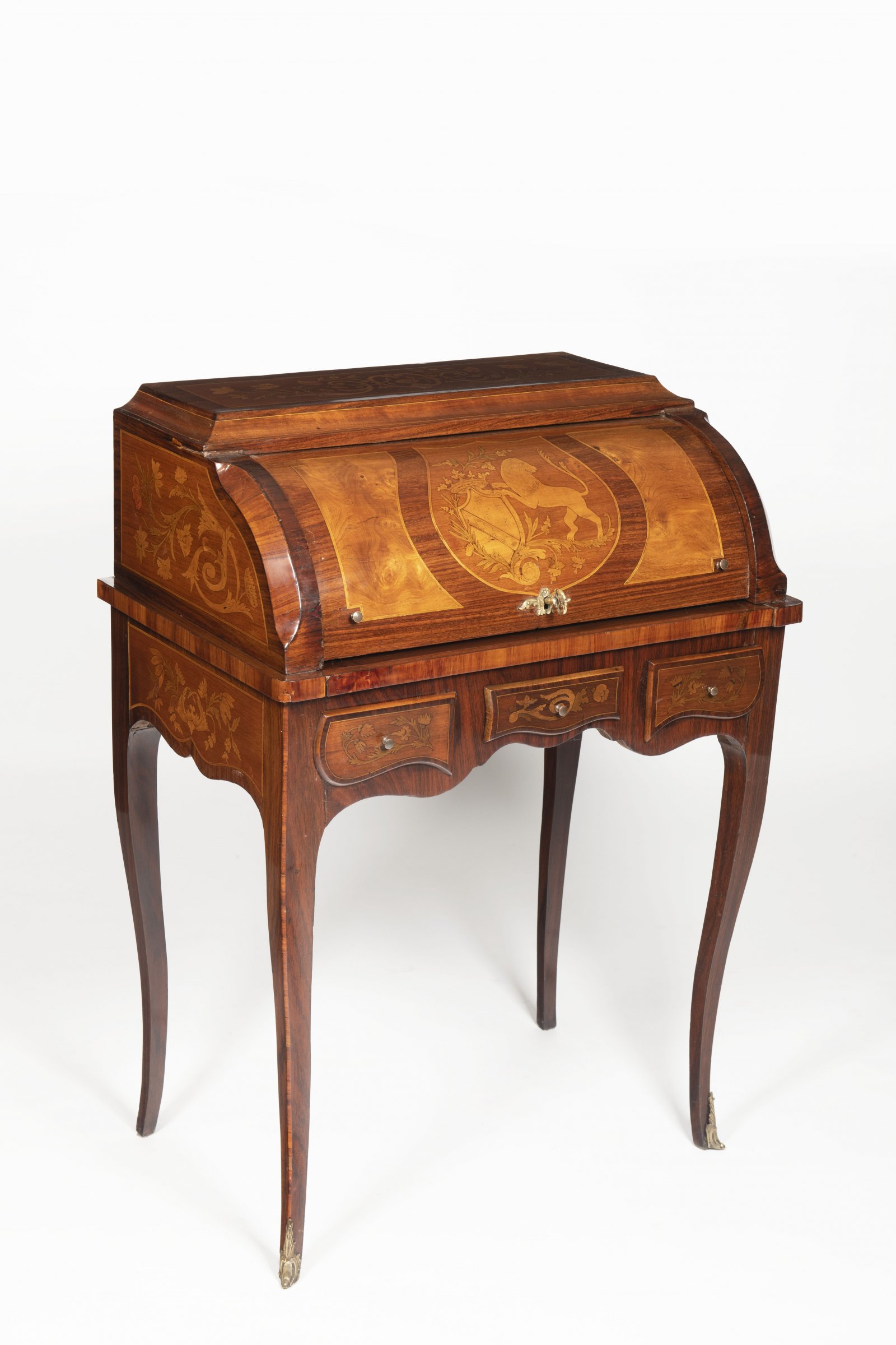 Lovely richly inlaid Neo-Rococo bureau with folding plate with inlaid motif of a still life with a letter. Three drawers below, inside also three drawers together with three boxes. Brilliantly crafted marquetry both in the depiction of a lion with heraldry and the lateral acanthus rococo motif. Lockable fittings with key. Completely restored, good condition, writing plate with cracks.