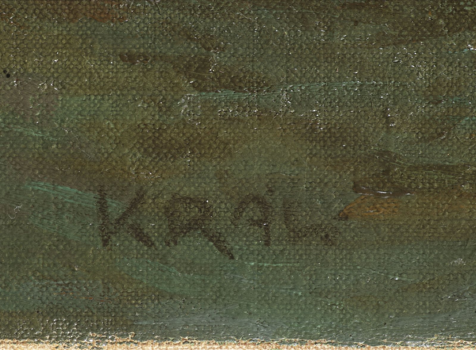 Josef Král studied at the academy under Julius Mařák and later under Rudolf von Ottenfeld. He won a travel scholarship and painted in Germany and France. On his travels, he focused mainly on painting the environment with ships and railways, but in his home environment he painted lovely atmospheric landscapes with village houses, rivers and trees in the early evening light. The painting of the forest illuminated by the last rays of the setting sun and the stream that cuts into a nearby meadow is one of his very successful depictions of the shape of the Czech landscape.