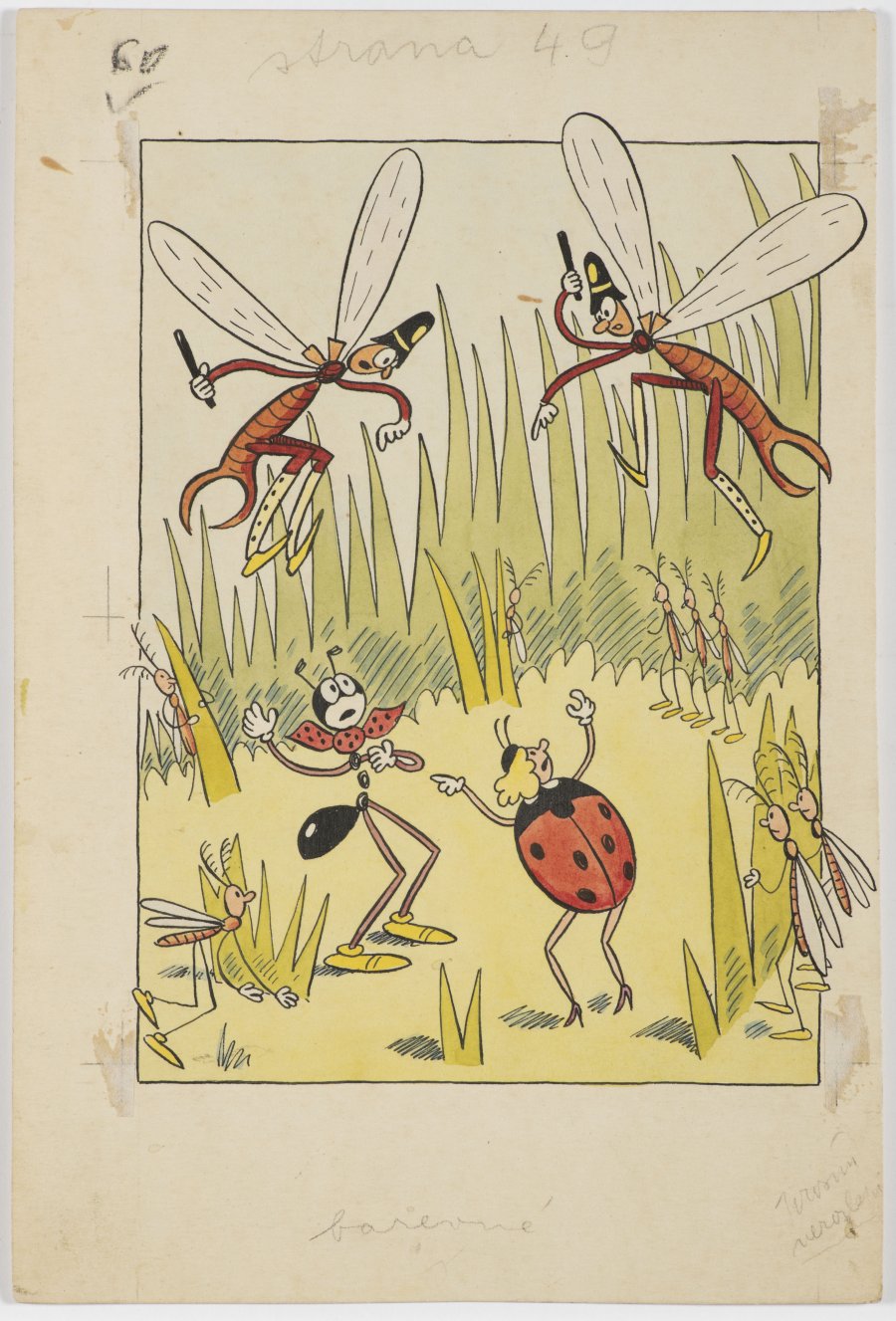 Illustration from the chapter "How the Snail was glad that Ferda scratched his back". After a misunderstanding with Ladybug, who is offended and misunderstands Ferda's friendly greeting, Ferda is arrested by the goblins and locked up with Mr. Snail. He is sentenced to a beating in court, but escapes thanks to the Cricket.