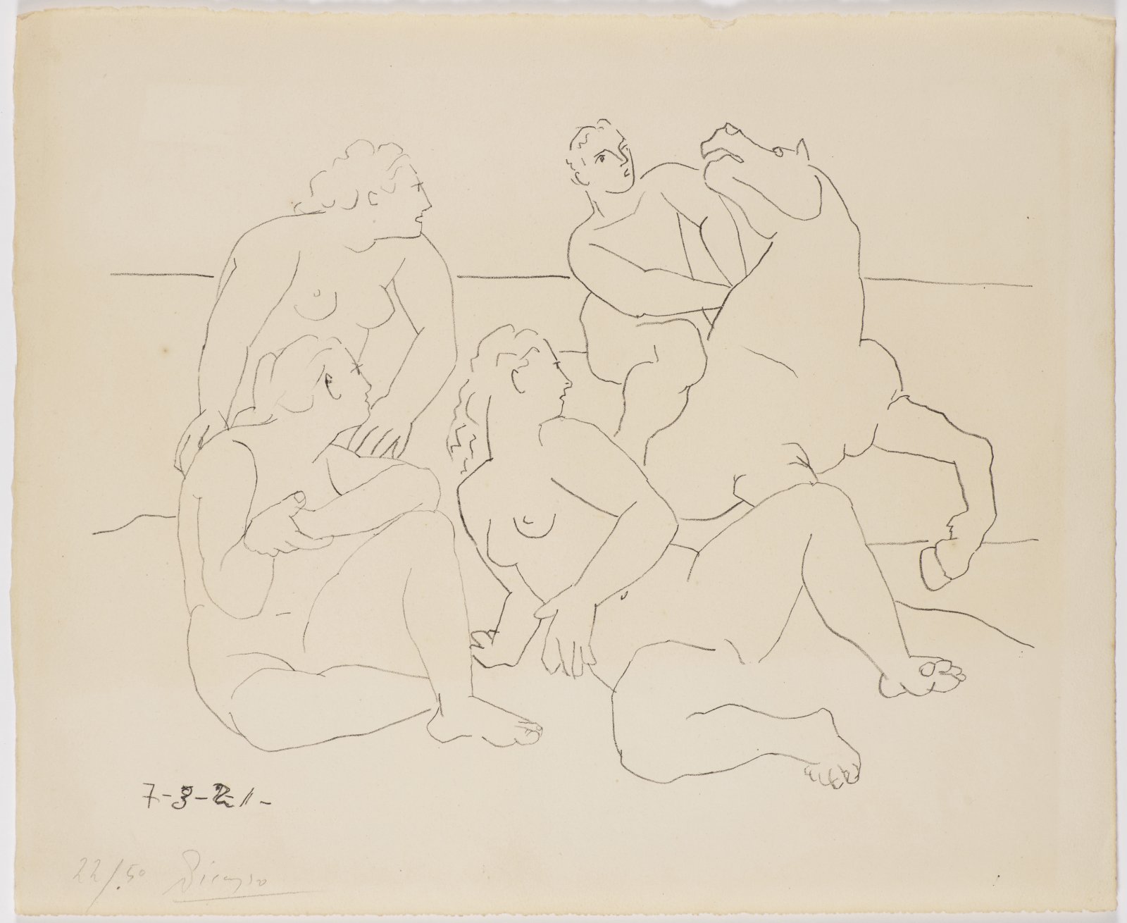 After Picasso left Juan-les-Pins in 1920, he drew a group of figures on the seacoast in lithographic pencil in the spring of the following year. The motifs – Rider, Wrestlers, On the Beach – burst with the power of life, with minimal outlines embracing all of the vital fullness of the nude bodies (in 1921, while residing in Fontainebleau for the summer, which was a particularly fruitful period, he painted Standing Woman – held by the National Gallery in Prague).