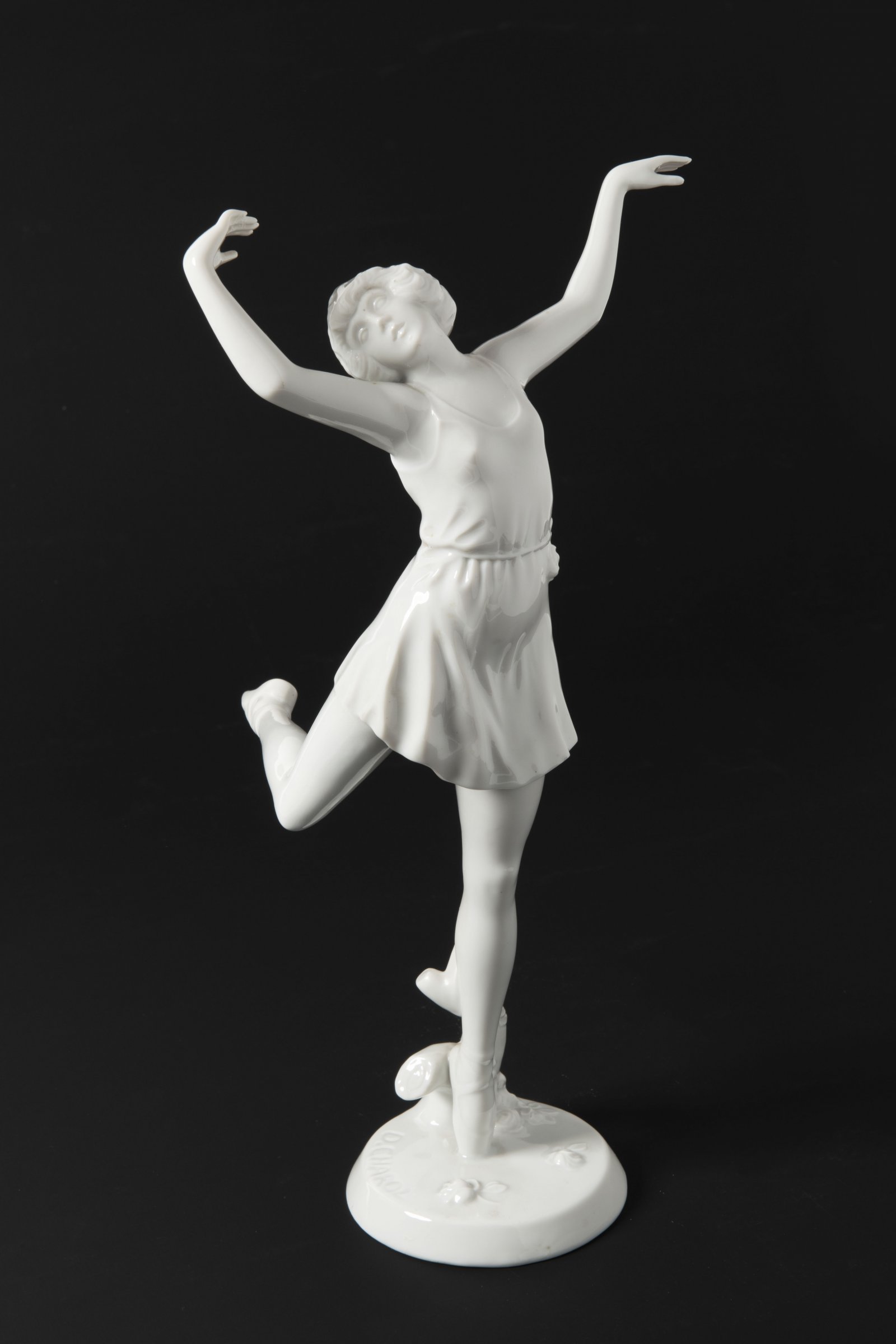 A dancing ballerina on tiptoes with her arms raised and head slightly bowed on an octagonal stepped pedestal with flowers. White glazed porcelain, green underglaze maker's mark Rosenthal Bavaria, circa 1930. Designed by the model maker Dorothea Charol.